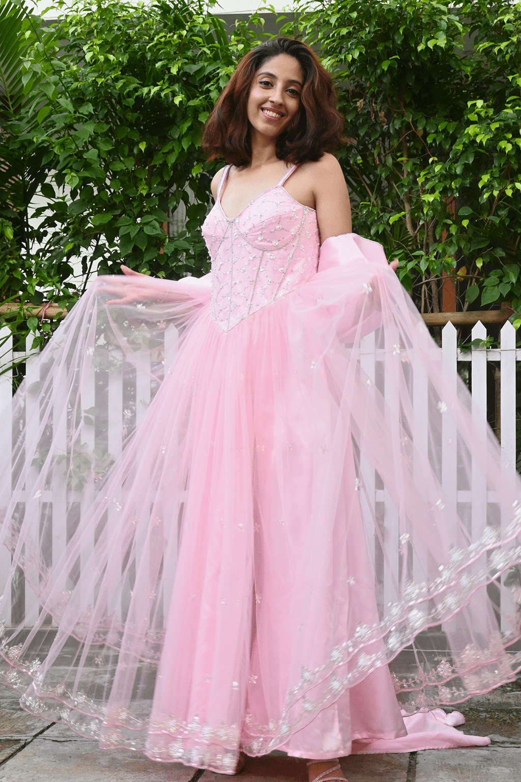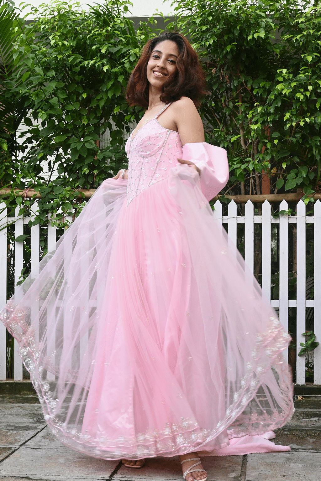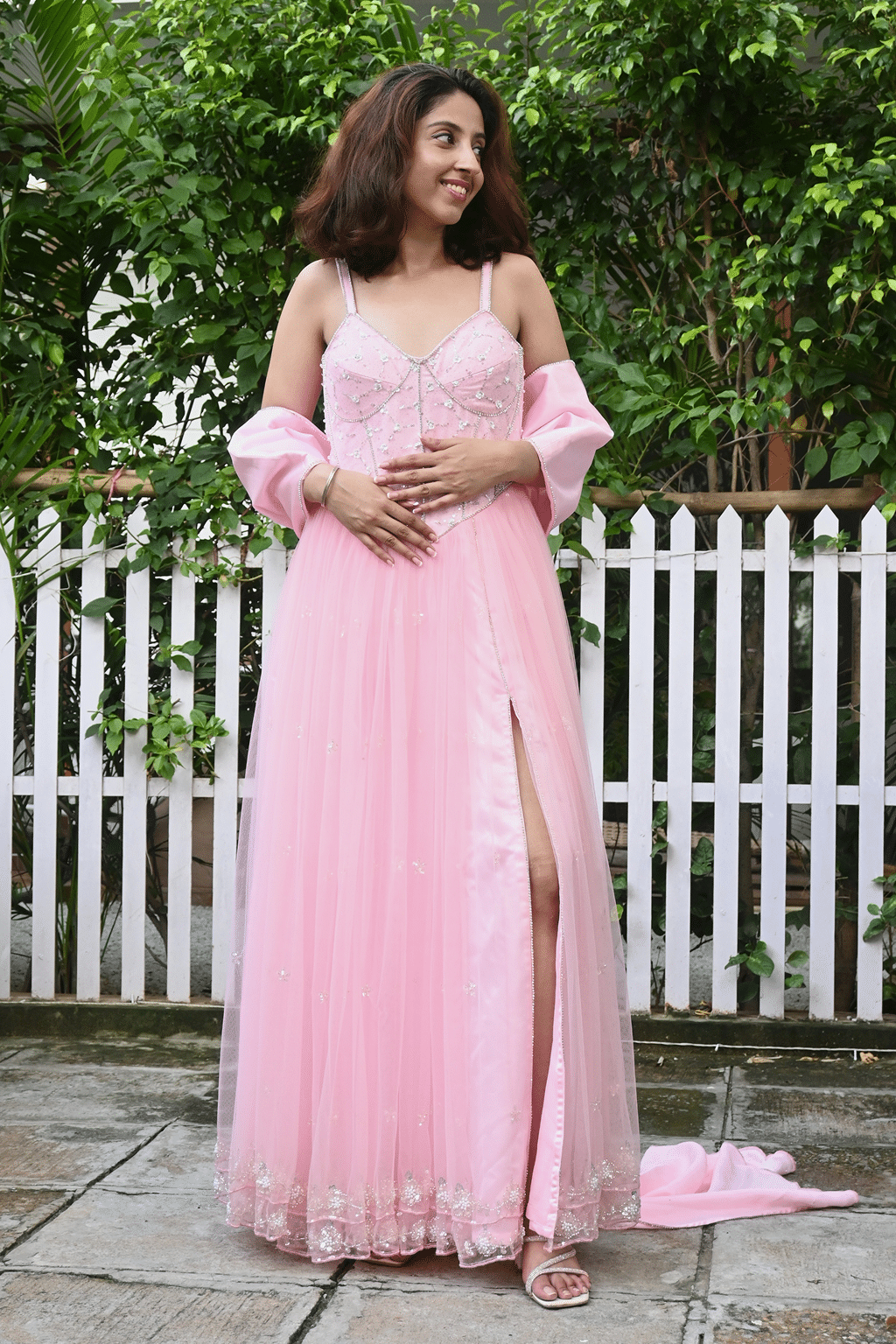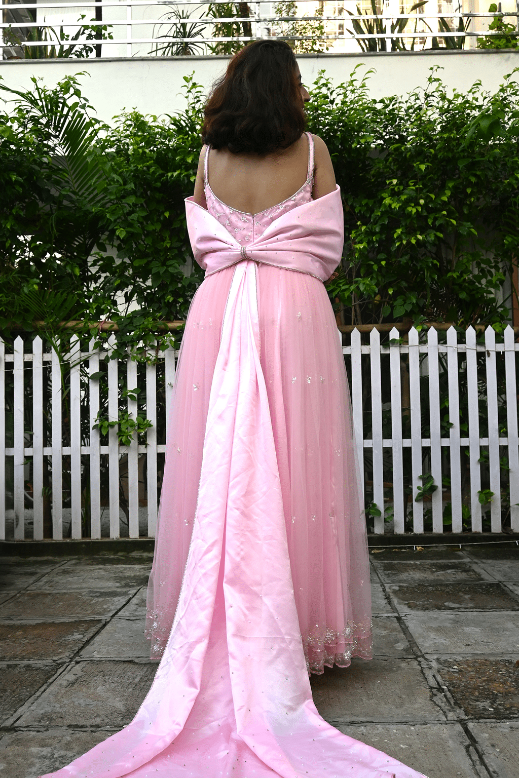 Blush pink corset gown with pearl handwork bow sleeve trail