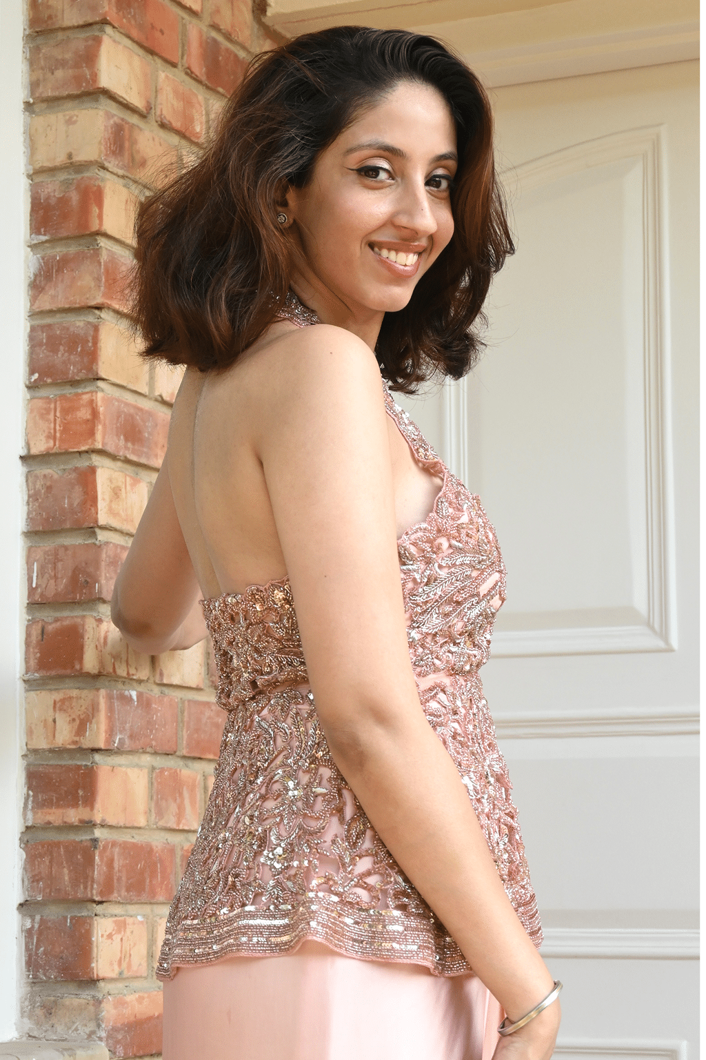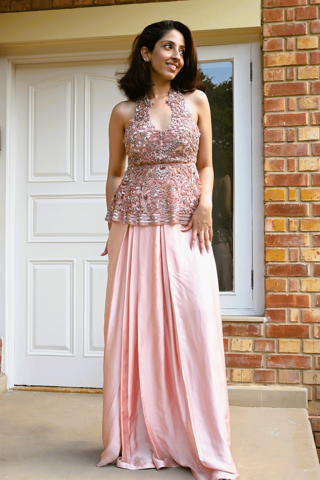 Blush pink silk skirt with heavy embroidered halter peplum top
