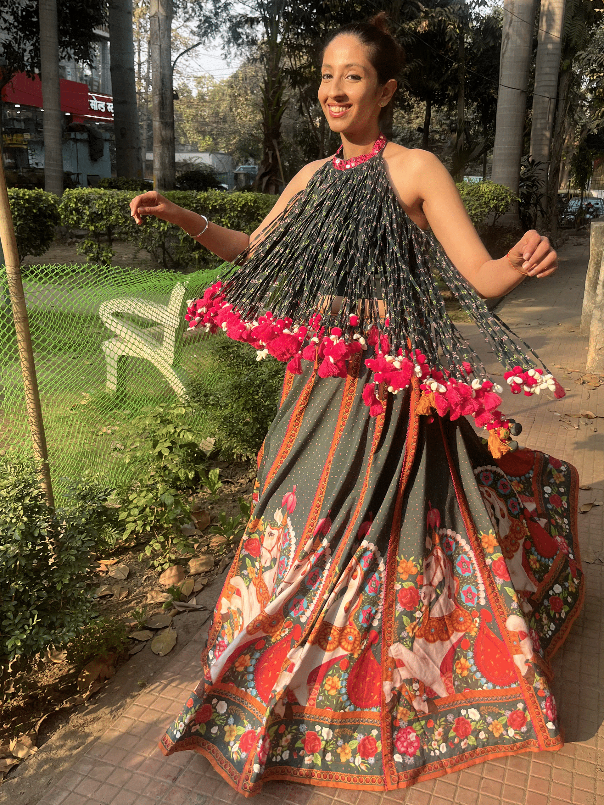 Bold yet romantic, the structured blouse balances the playful print, making it perfect for mehendi mornings, sangeet nights, and everything in between.
