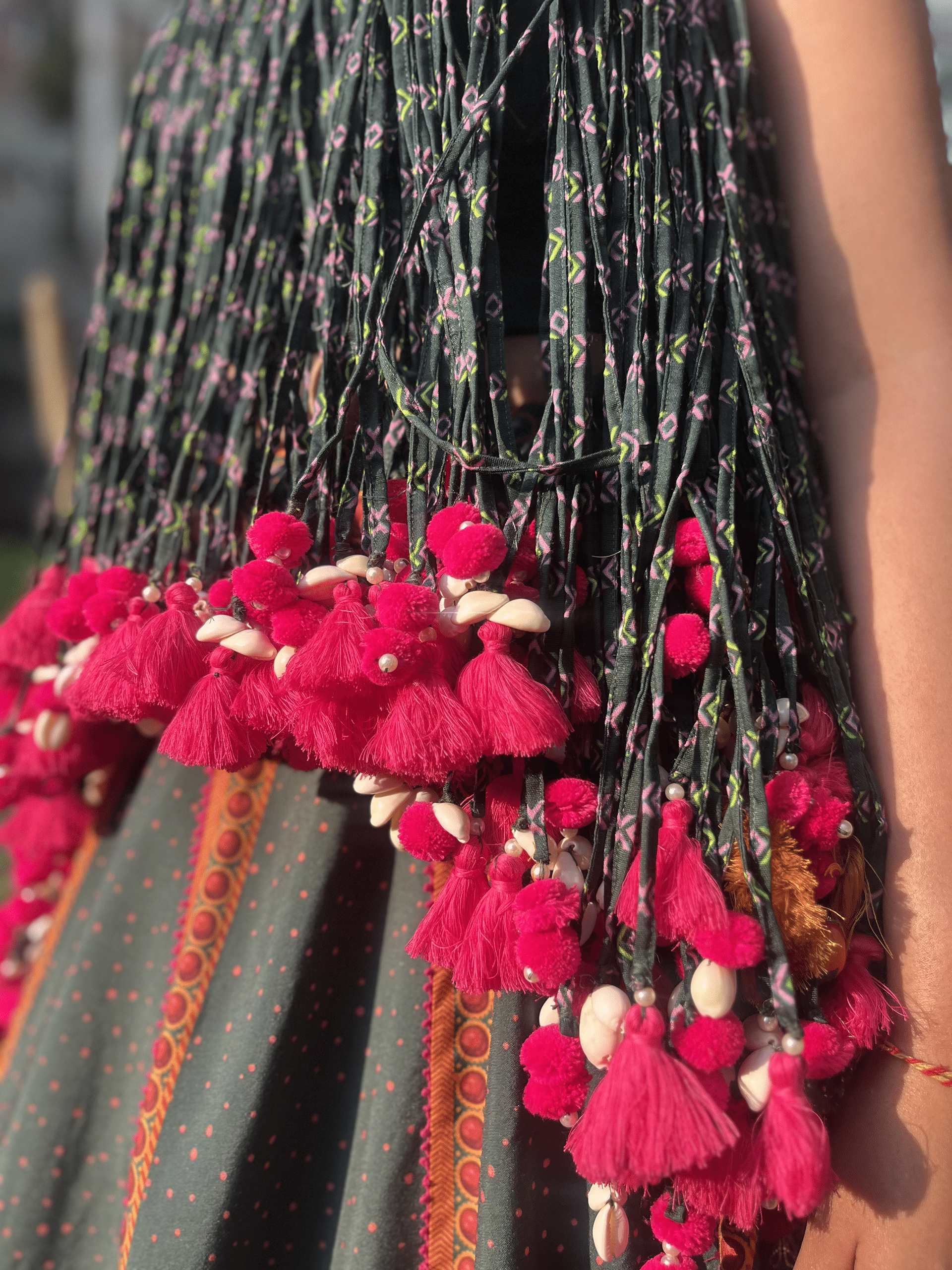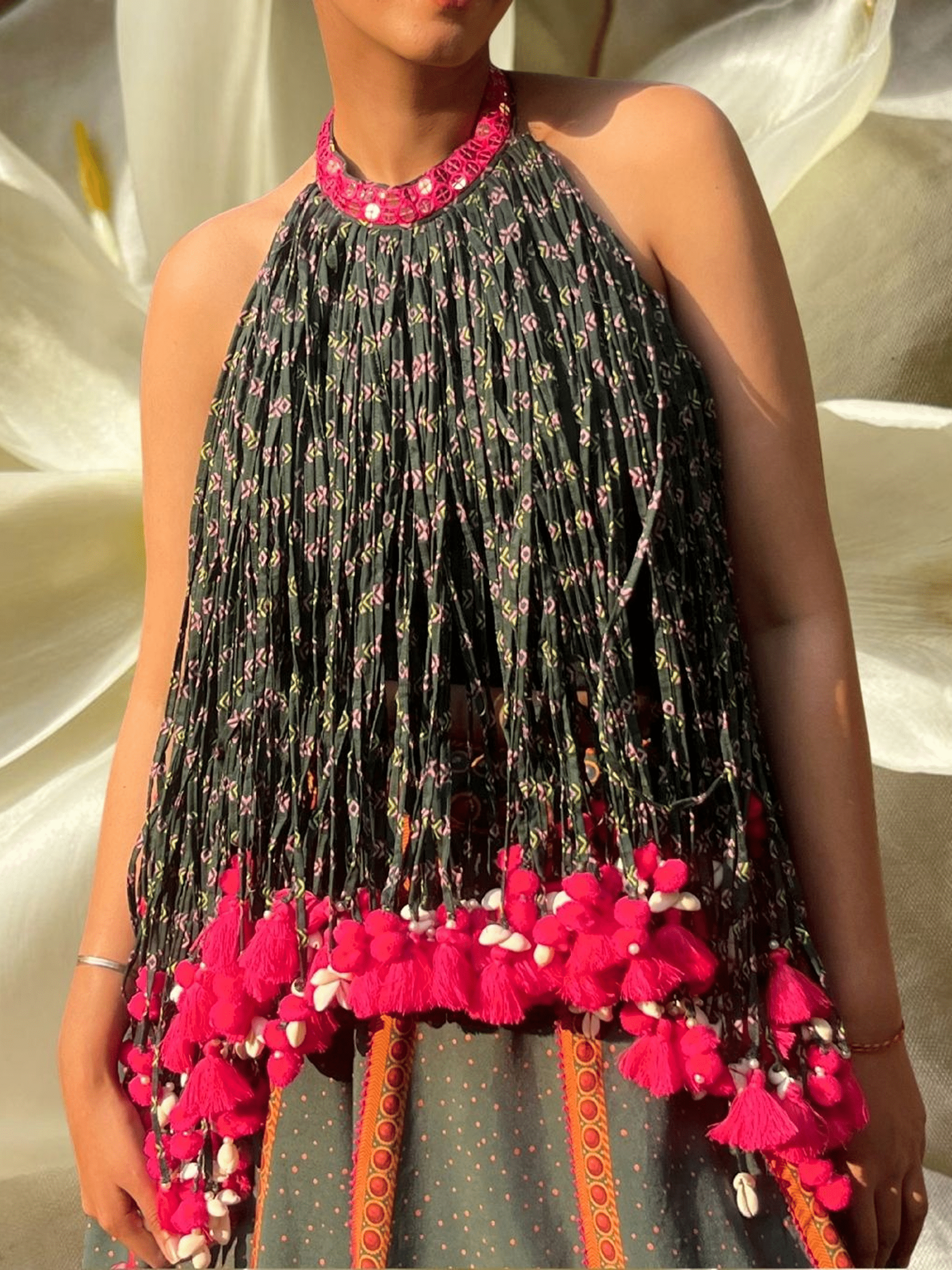 A pleated halter blouse crafted in soft printed georgette, designed to flow and move with you. The gathered drape falls into vibrant fuchsia tassels and shell accents, adding playful texture and festive energy.