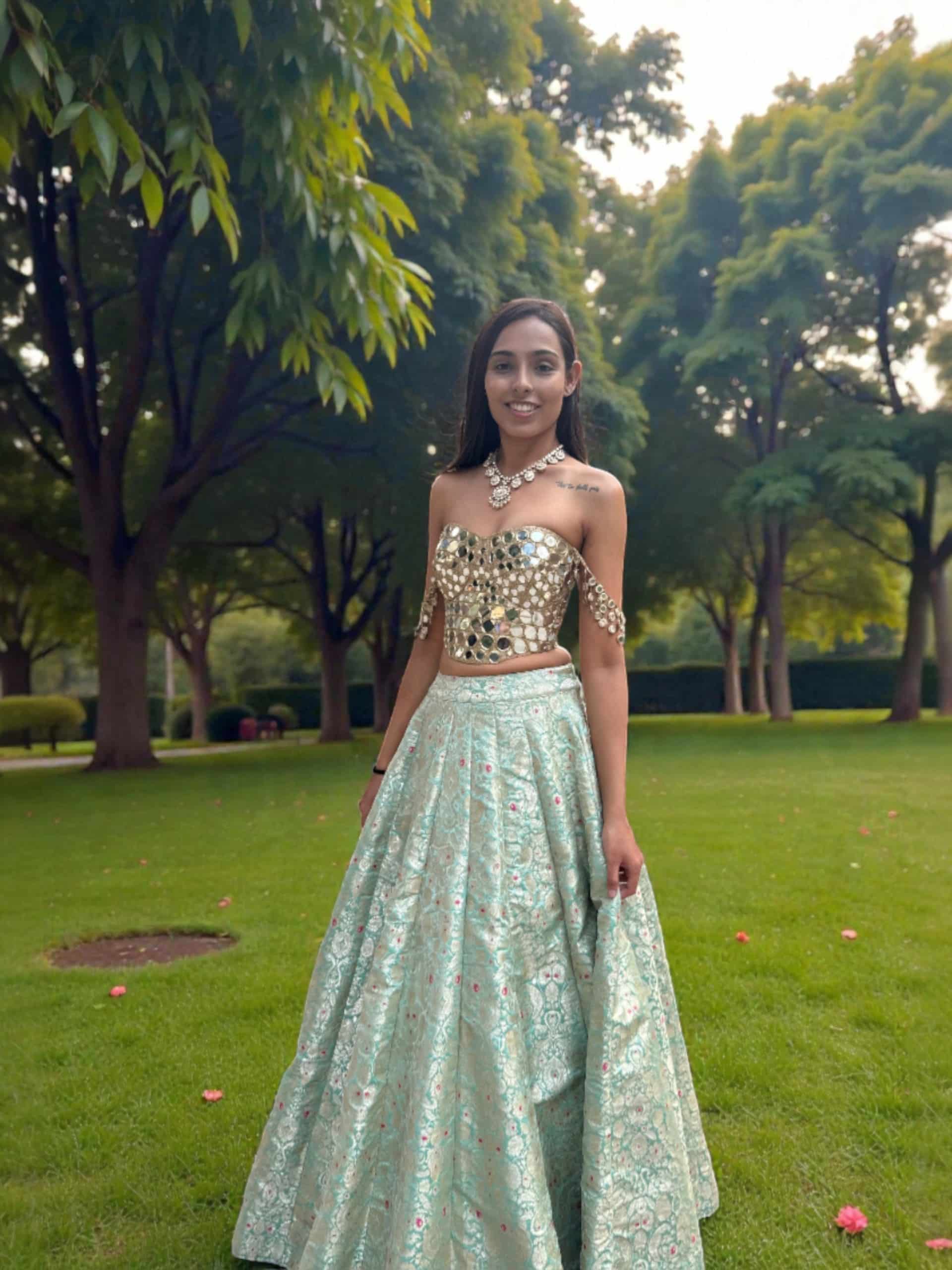 Fresh colour meets clean structure. This set brings together subtle shine and easy movement, making it perfect for daytime functions, outdoor gatherings, and modern festive dressing.