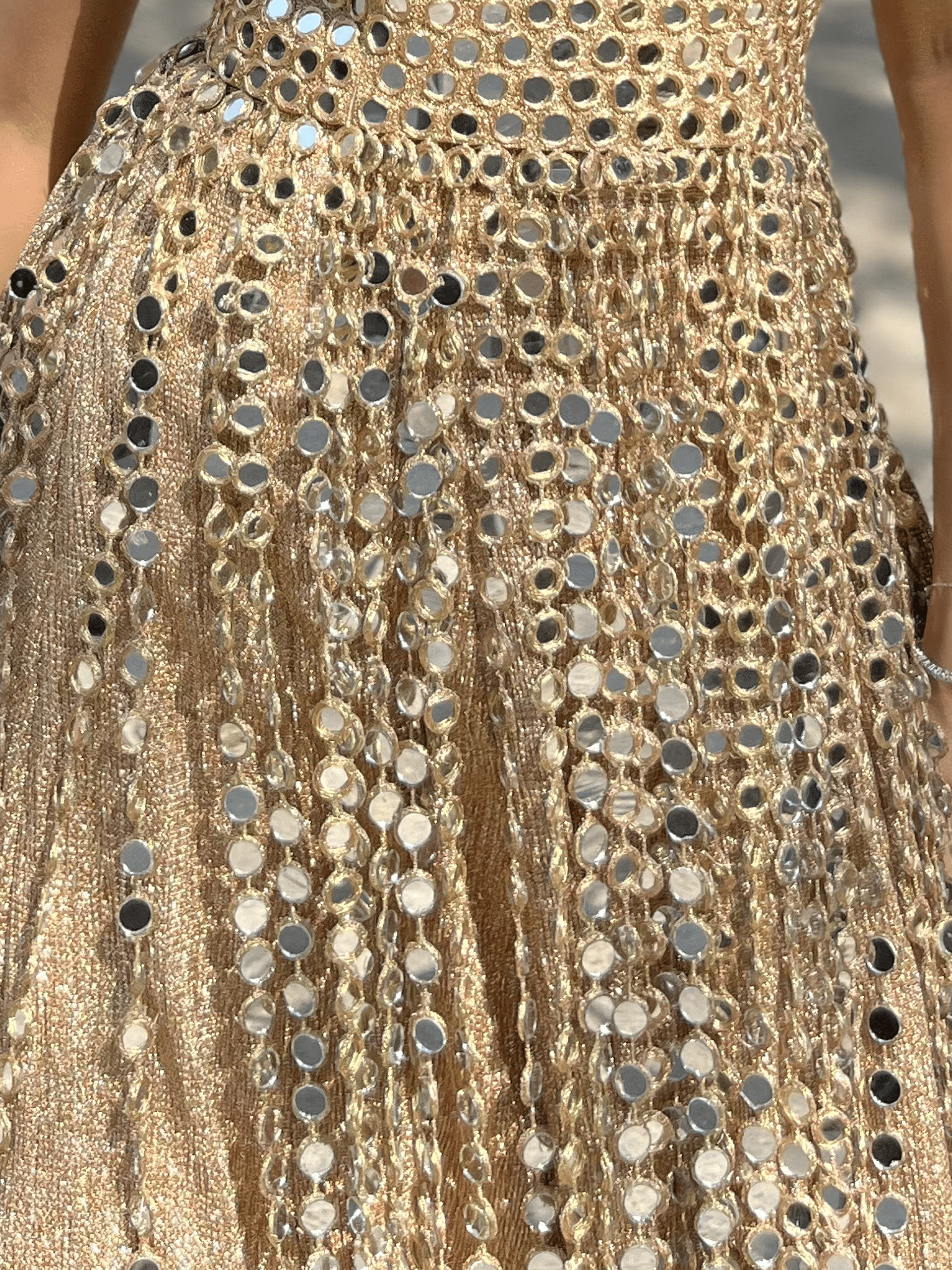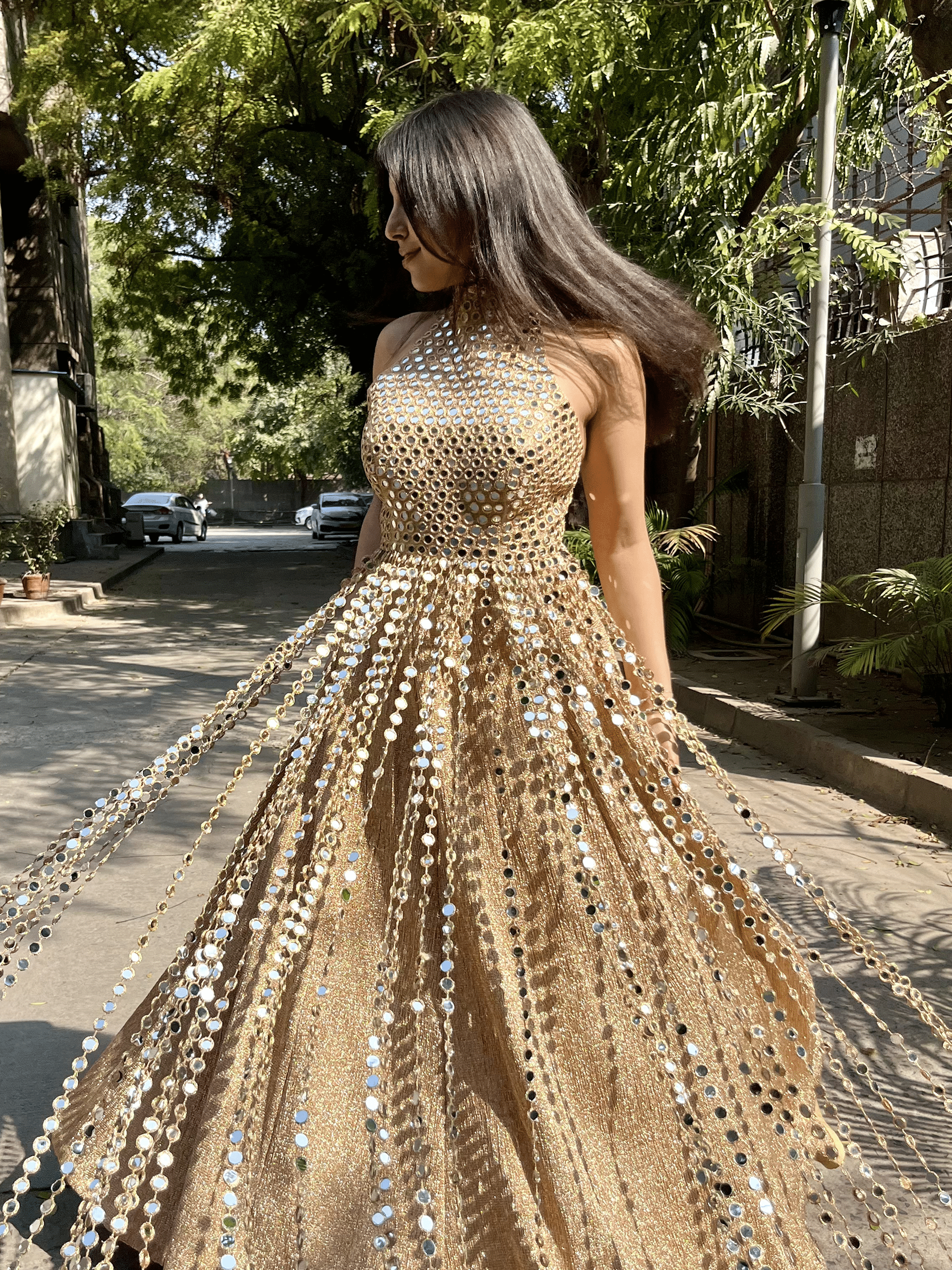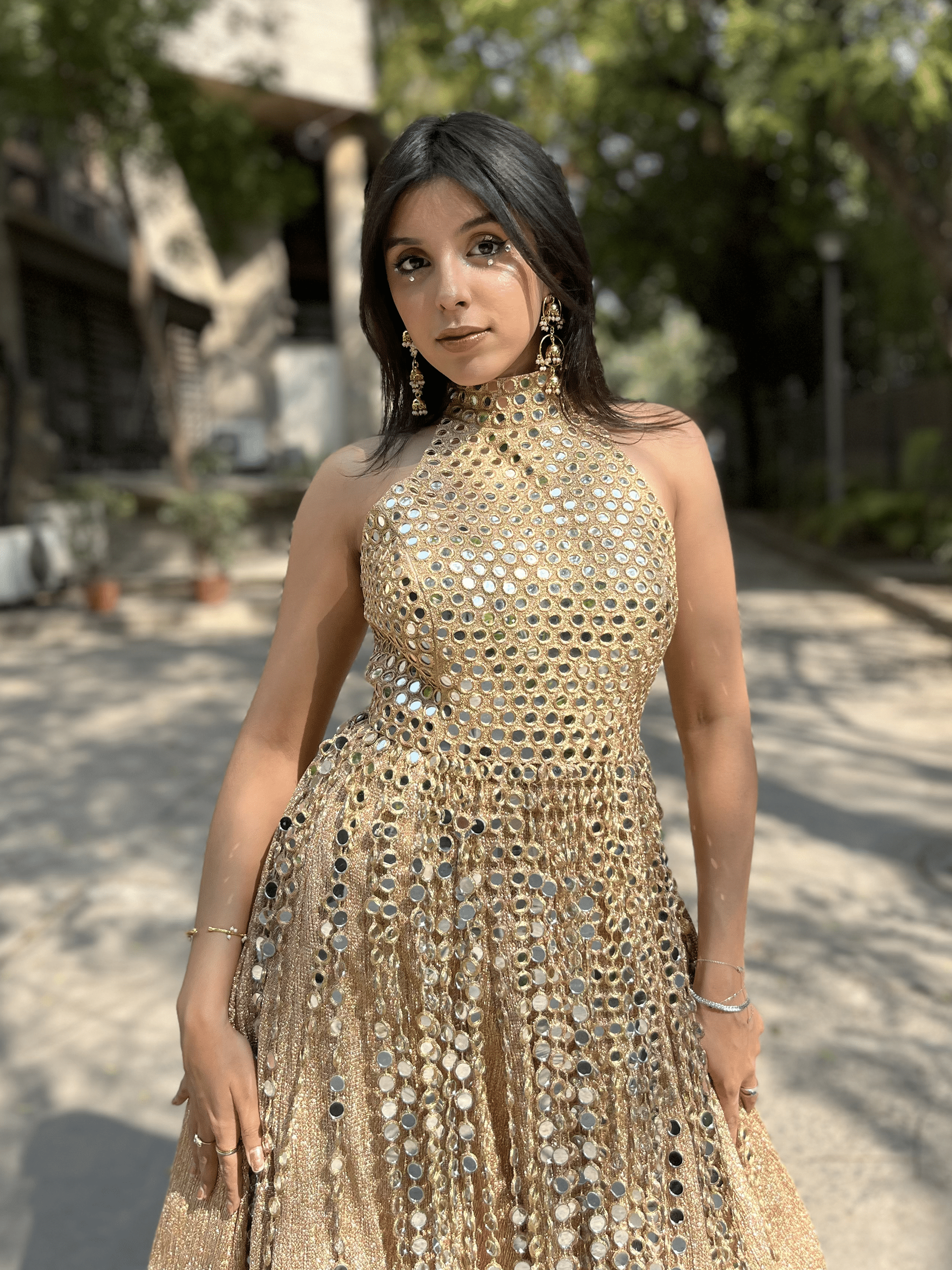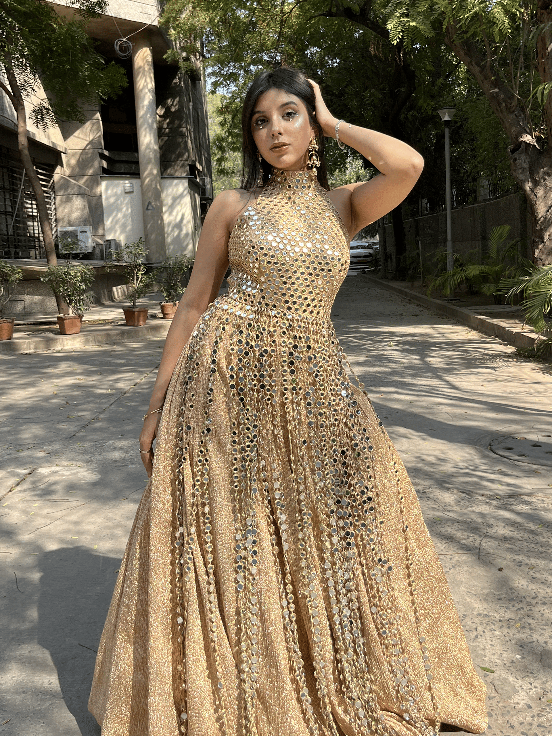 A striking halter-neck silhouette drenched in intricate mirror embroidery, designed to catch every flicker of light. The high neckline and sculpted bodice balance the shimmer with structure, while the flared skirt moves like liquid gold with every step.