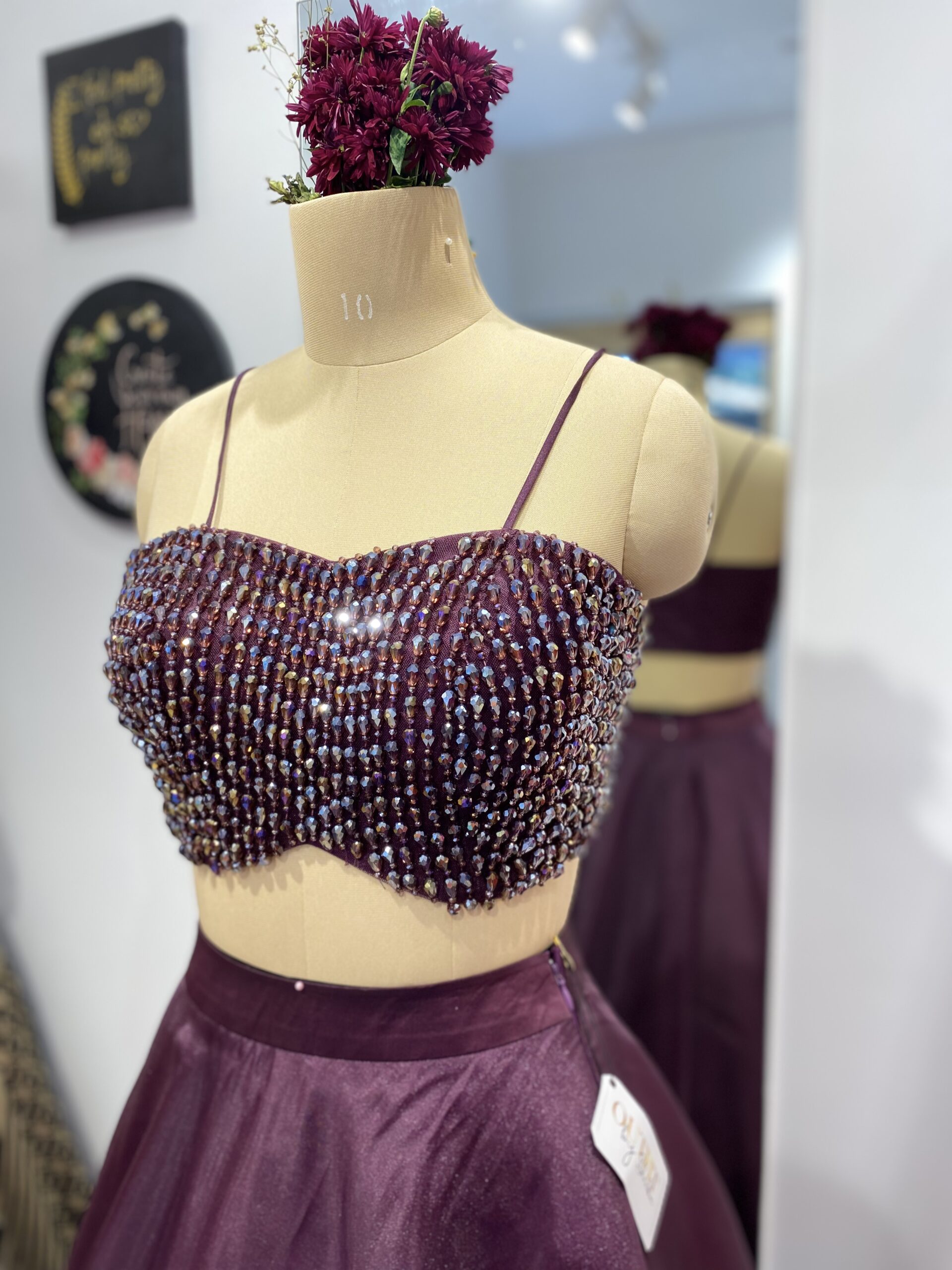 A refined plum satin lehenga paired with a delicately beaded corset blouse for a modern yet elegant silhouette. The softly flared satin skirt drapes fluidly, creating graceful movement, while the textured, hand-embellished blouse adds depth and subtle sparkle. Designed for evening celebrations, cocktail events, receptions, and contemporary festive occasions, this ensemble balances minimal elegance with statement detailing. Perfect for those who prefer understated glamour with a strong silhouette.