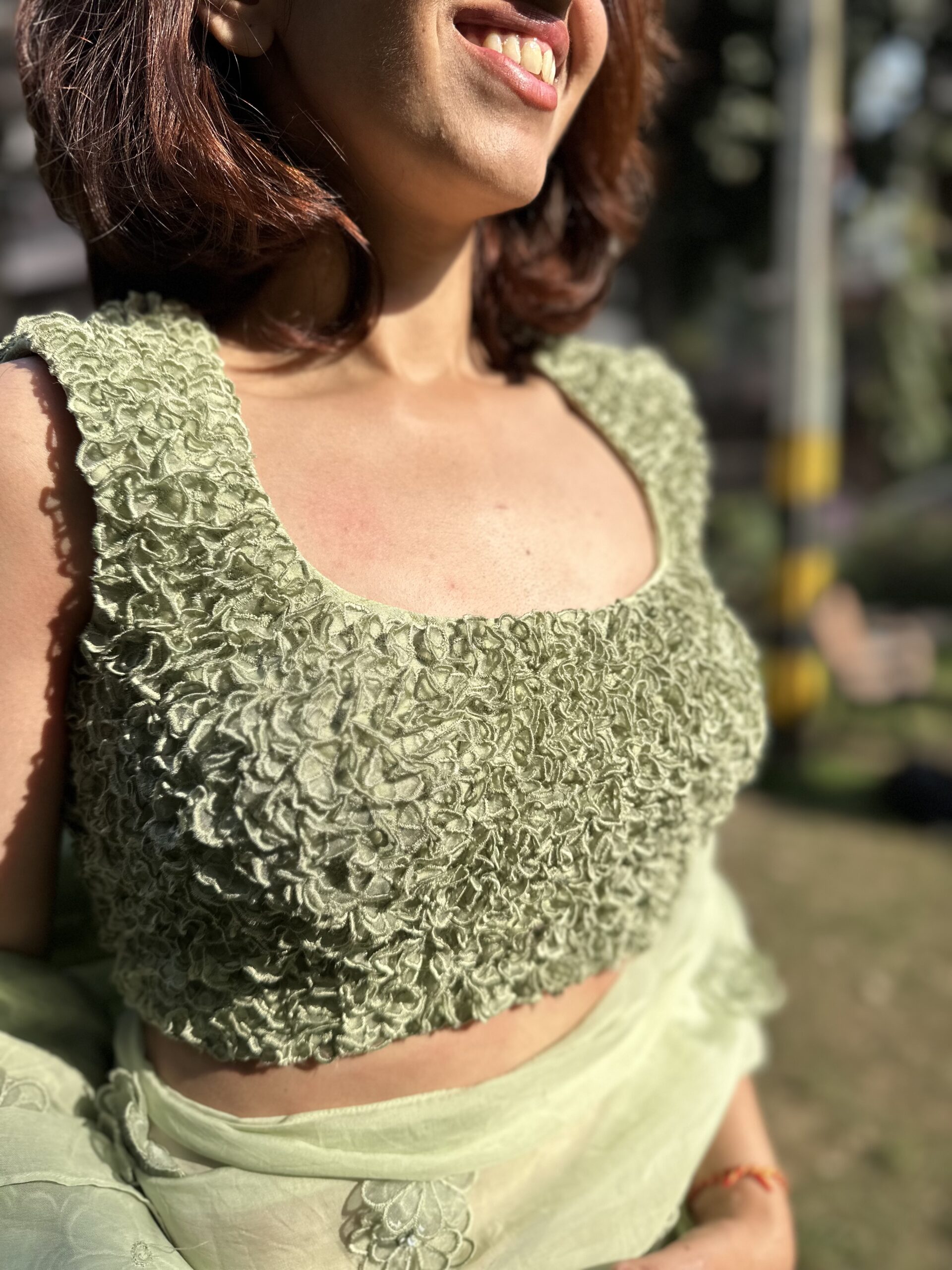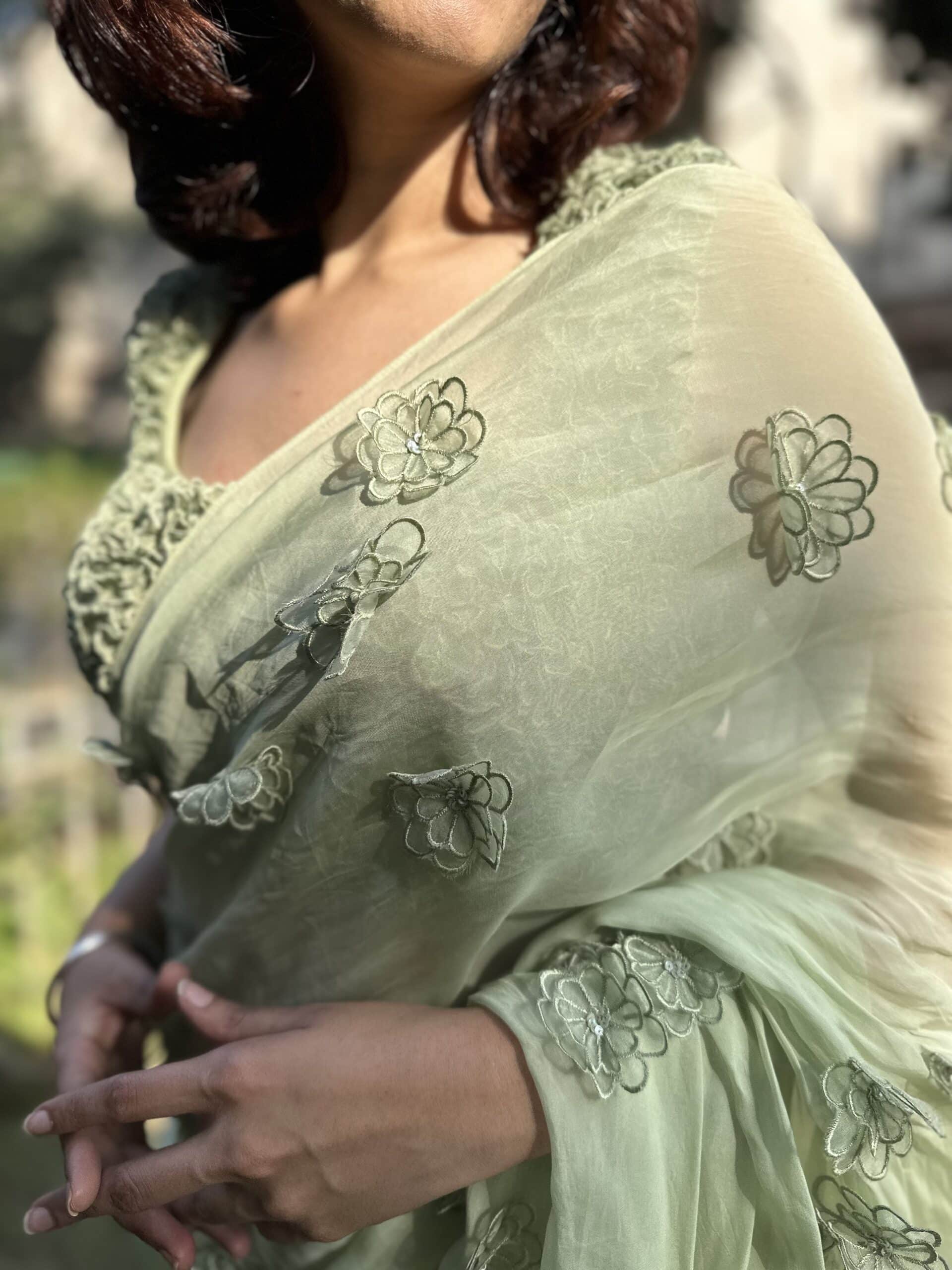 Elara is soft, modern, and intentionally minimal. This pistachio saree blends gentle embellishment with airy movementâmade for bridesmaids who value comfort, elegance, and timeless appeal.