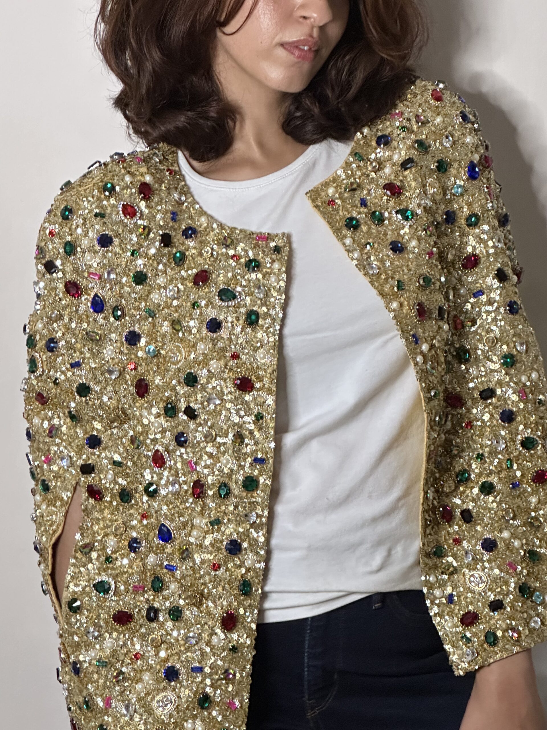 Part of our modern festive edit, this gold embellished jacket adds instant drama to understated outfits. Lightweight yet impactful, it’s made for bridesmaids who prefer sharp styling with a celebratory edge.