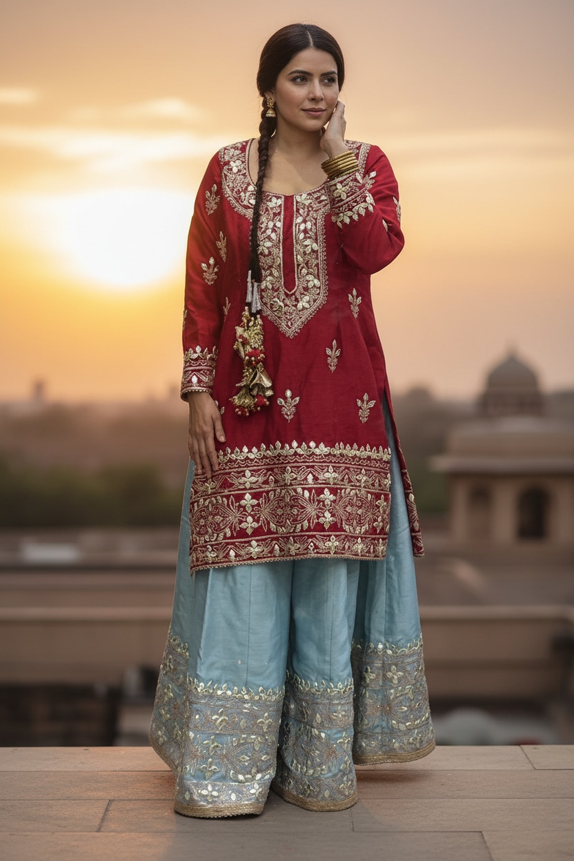 Gulnaar Noor blends a deep crimson kurta with soft powder-blue sharara pants, brought together by intricate gold embroidery. Designed for bridesmaids who want tradition with ease, this look feels regal yet relaxed—perfect for mehendi evenings or intimate wedding ceremonies.