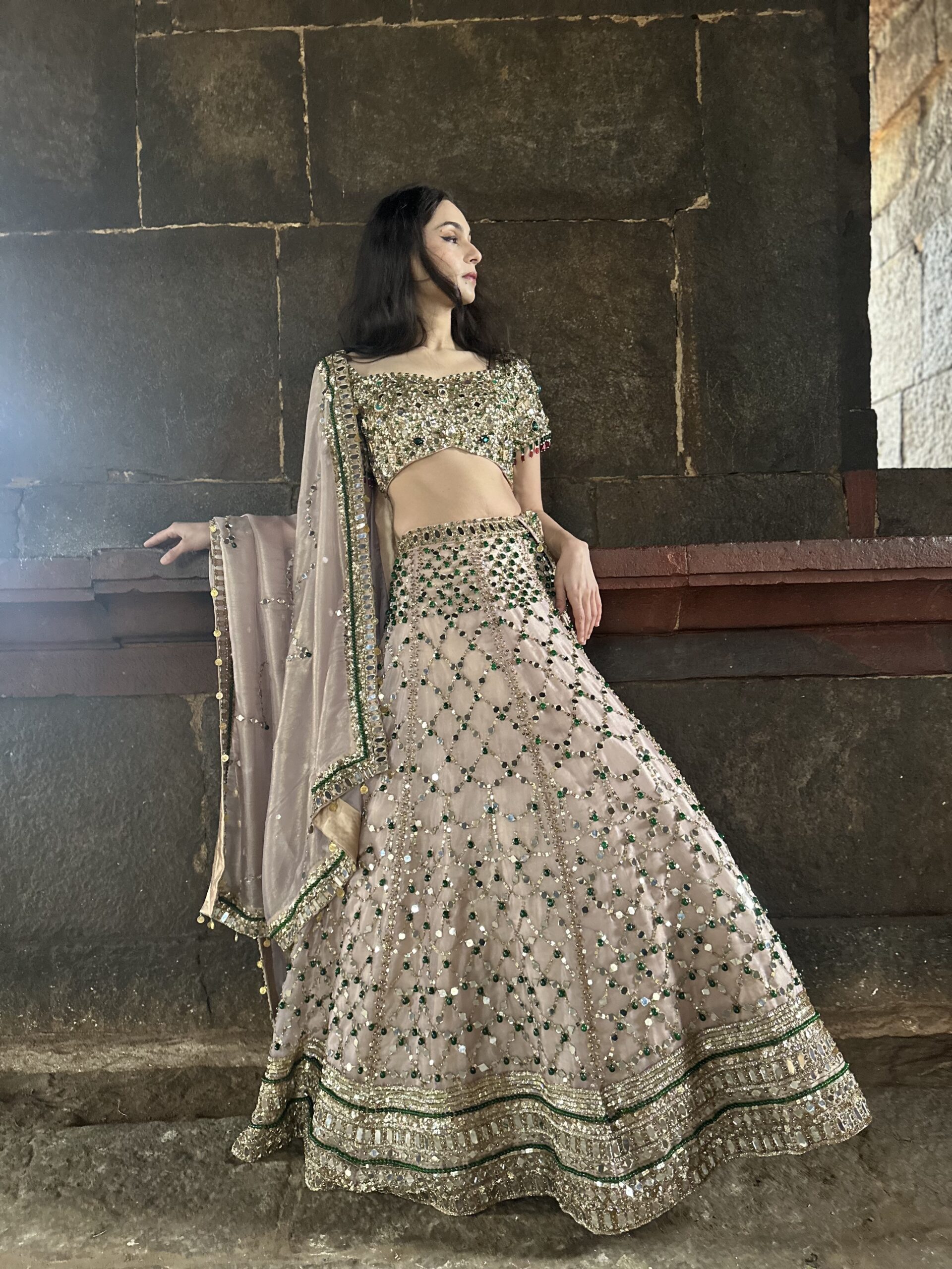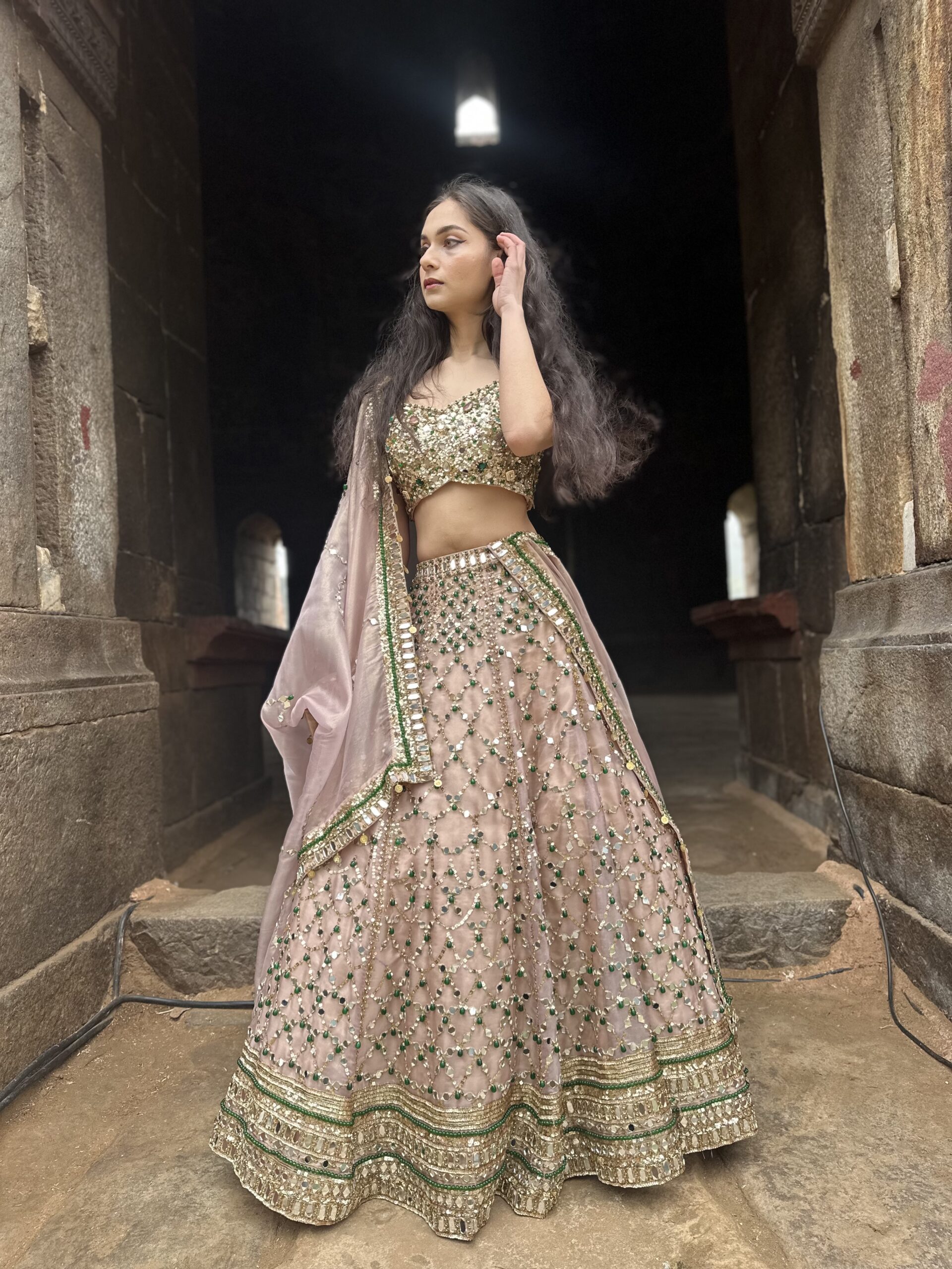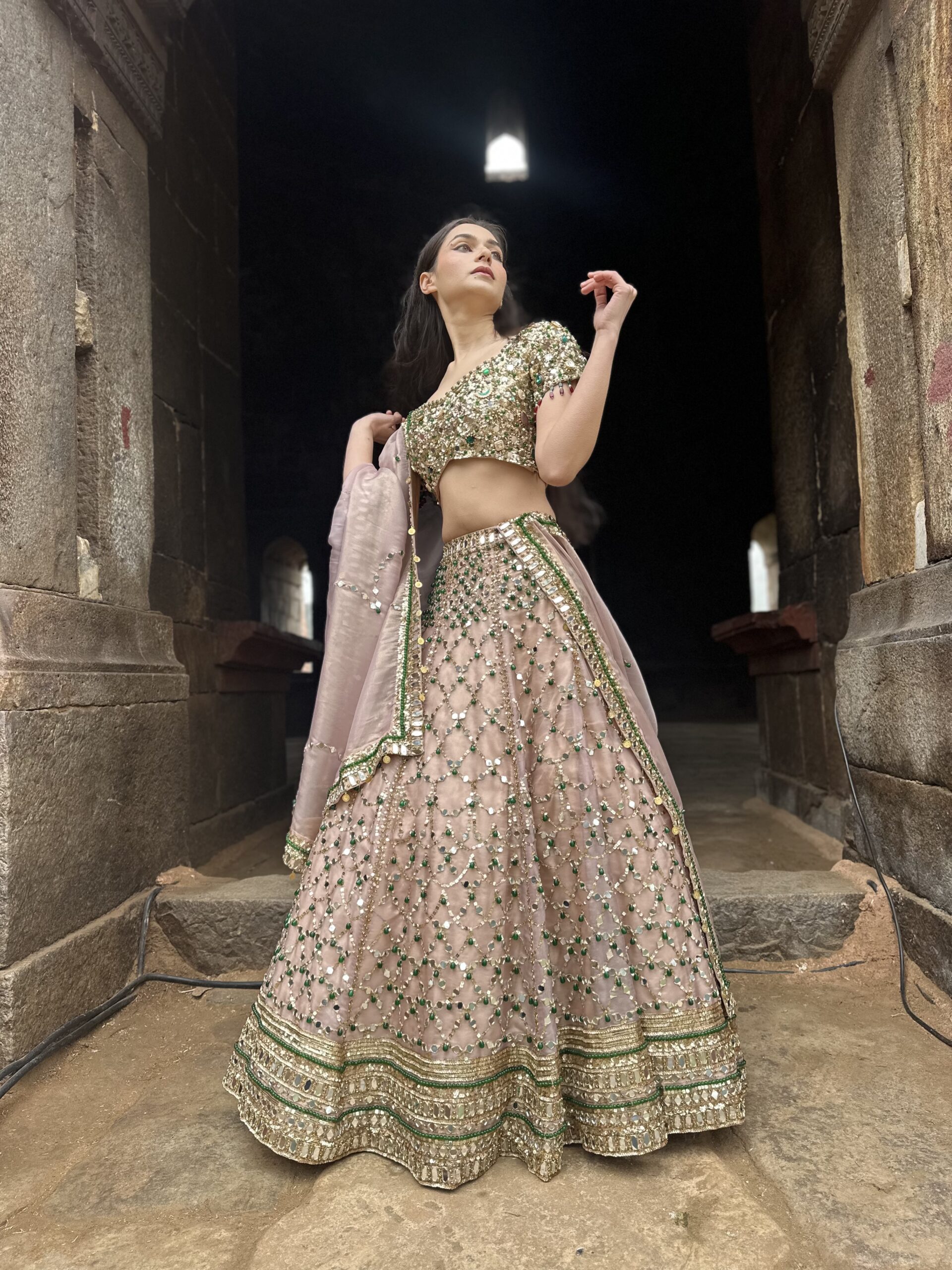 The Ira Blush Crystal Lehenga Set brings subtle shimmer and structure together in a silhouette made for modern wedding celebrations. The fitted blouse is intricately embellished, while the lehenga skirt flows with soft movement and fine mirror detailing that catches the light beautifully. Designed to feel special yet effortless, itâs a versatile pick for bridesmaids across multiple wedding functions.