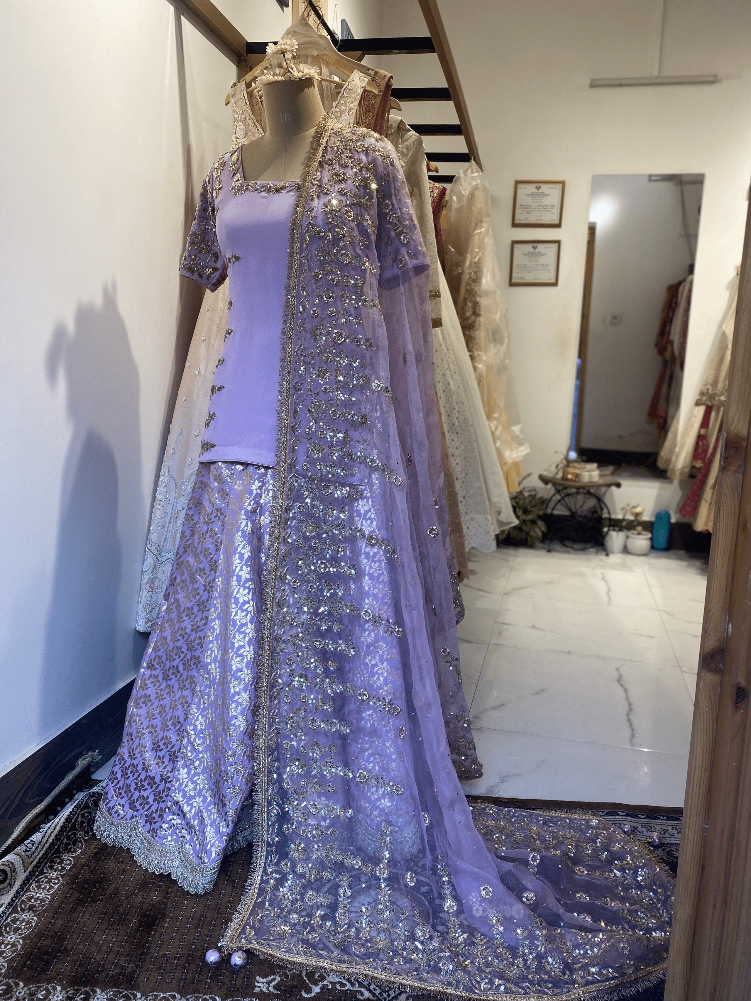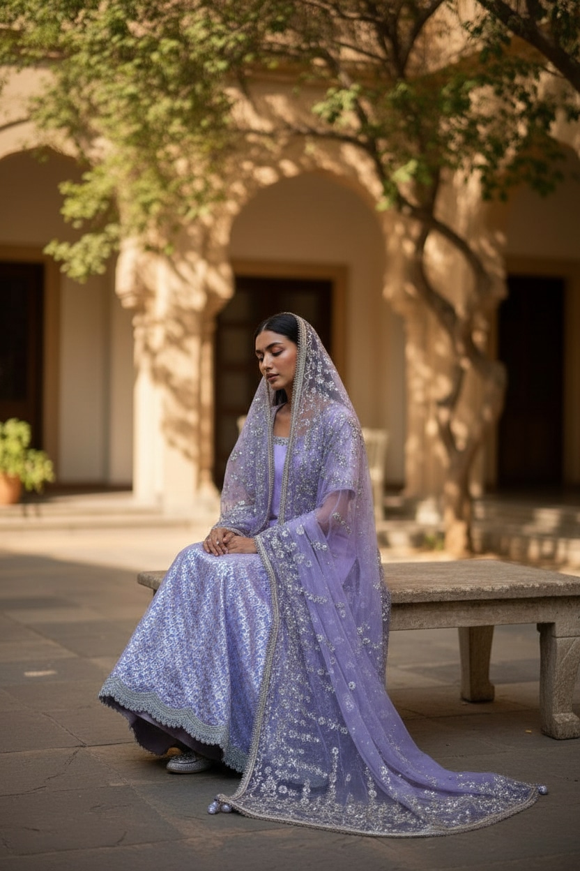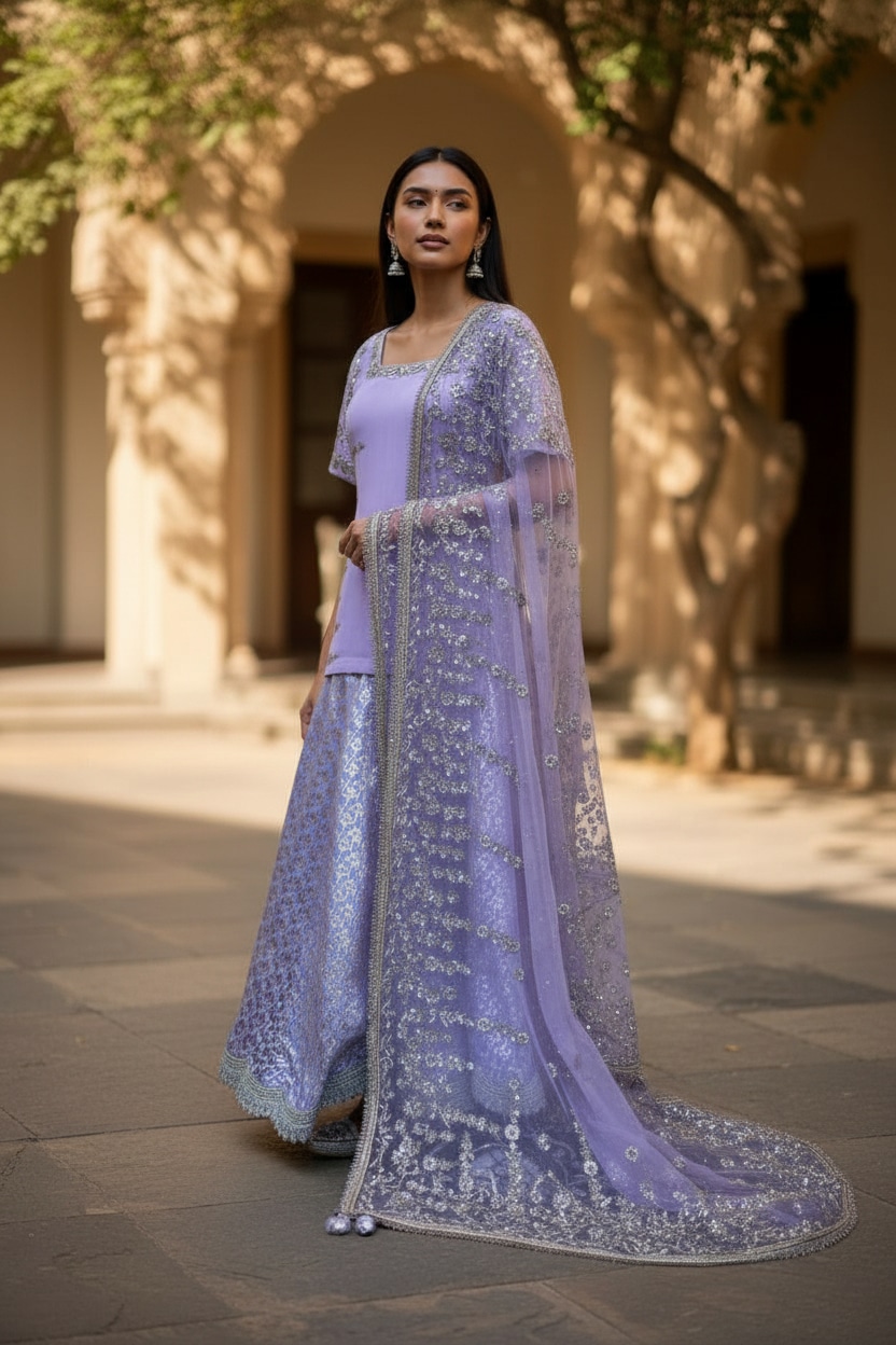 A soft lavender sharara set crafted for refined festive elegance. The straight kurta features delicate tonal embroidery along the sleeves and neckline, paired with a richly patterned sharara skirt that adds depth and texture. The look is completed with a sheer lavender dupatta, heavily embellished with shimmering floral embroidery and finished with a subtle border, creating graceful movement and light-catching detail. Balanced and elegant, this ensemble blends minimal structure with ornate surface work, making it ideal for weddings, festive celebrations, intimate receptions, and traditional gatherings. Style it with statement earrings for a polished, contemporary ethnic look.