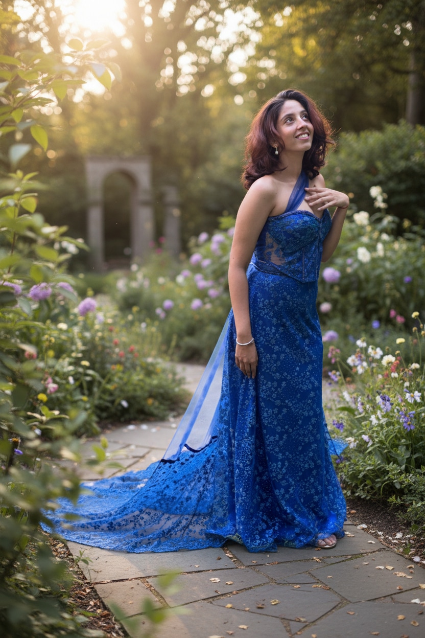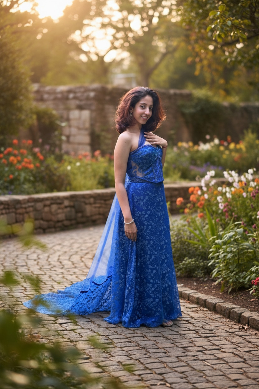 A striking cobalt blue lehenga set designed for modern bridesmaids and evening wedding celebrations. The ensemble features a fitted halter-neck blouse with delicate tonal patterning, paired with a flowing lehenga skirt that drapes effortlessly. Finished with a sheer trailing dupatta, the silhouette feels fluid, elegant, and fashion-forward.