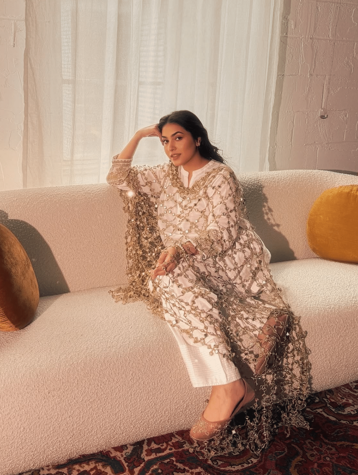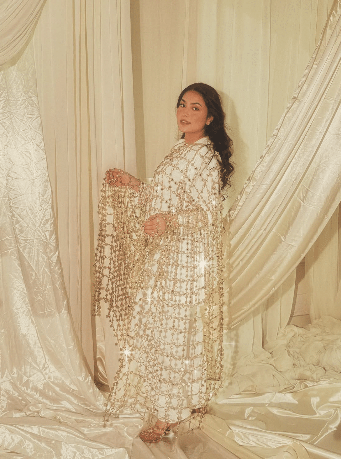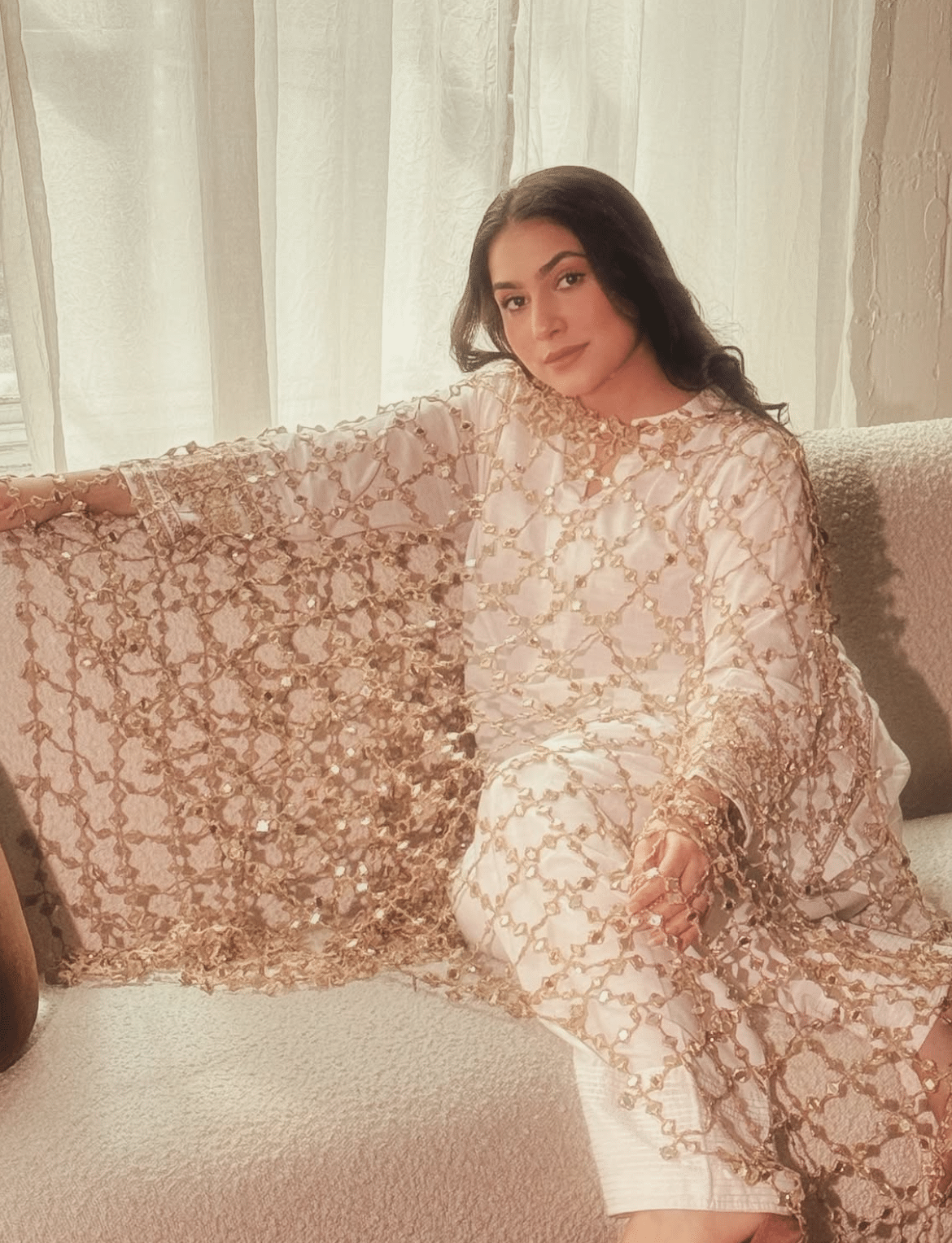 An airy mirror jaal dupatta that catches the light with every step. Perfect for bridesmaids looking to add glow and texture to clean, understated outfits.