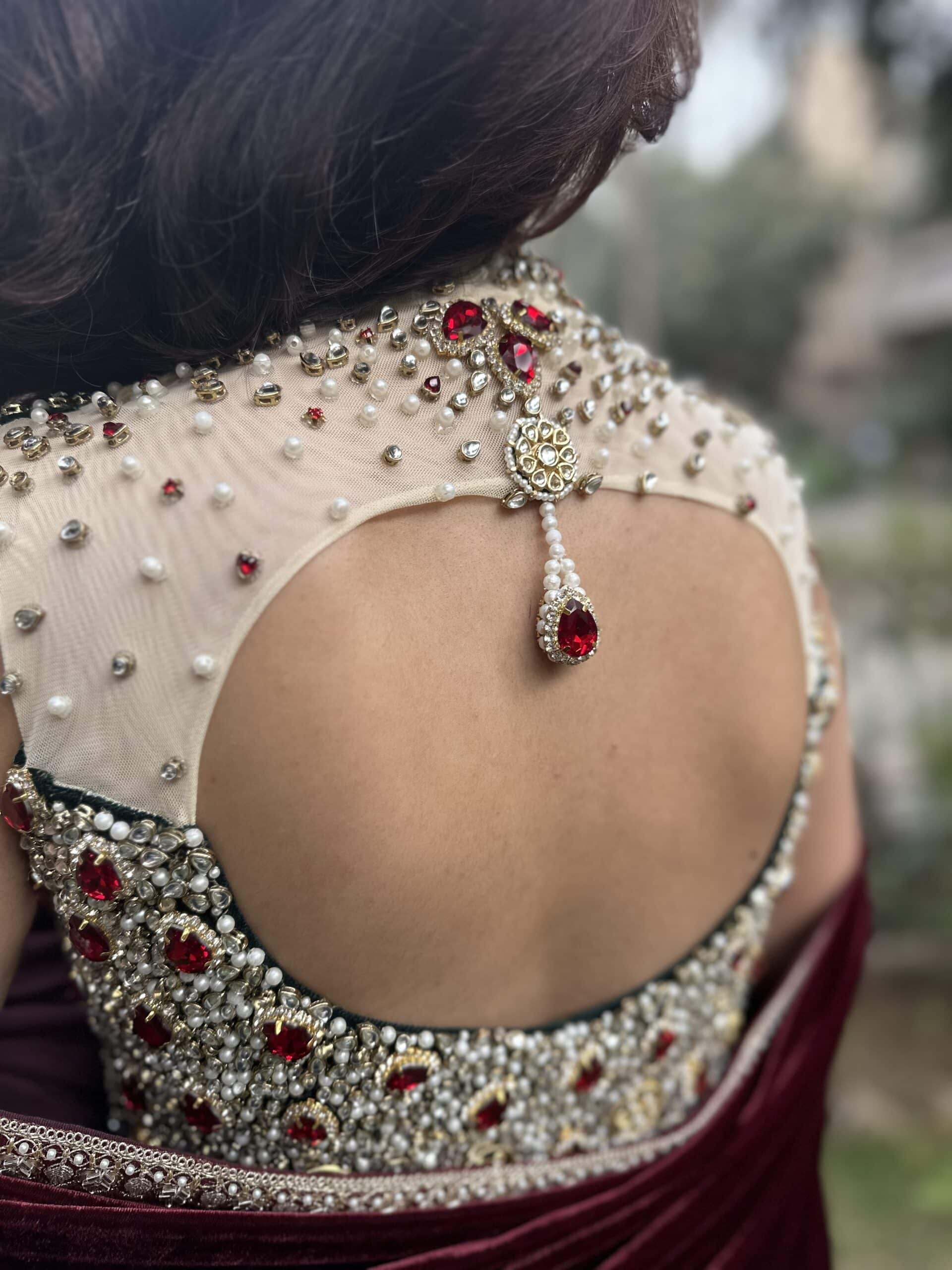 A luxurious burgundy velvet saree designed for elegant bridesmaids and evening wedding celebrations. The rich velvet drape is framed with a delicate embellished border, adding depth without excess. Paired with a finely embellished high-neck blouse accented with subtle ruby-toned details, the look feels regal yet contemporary.