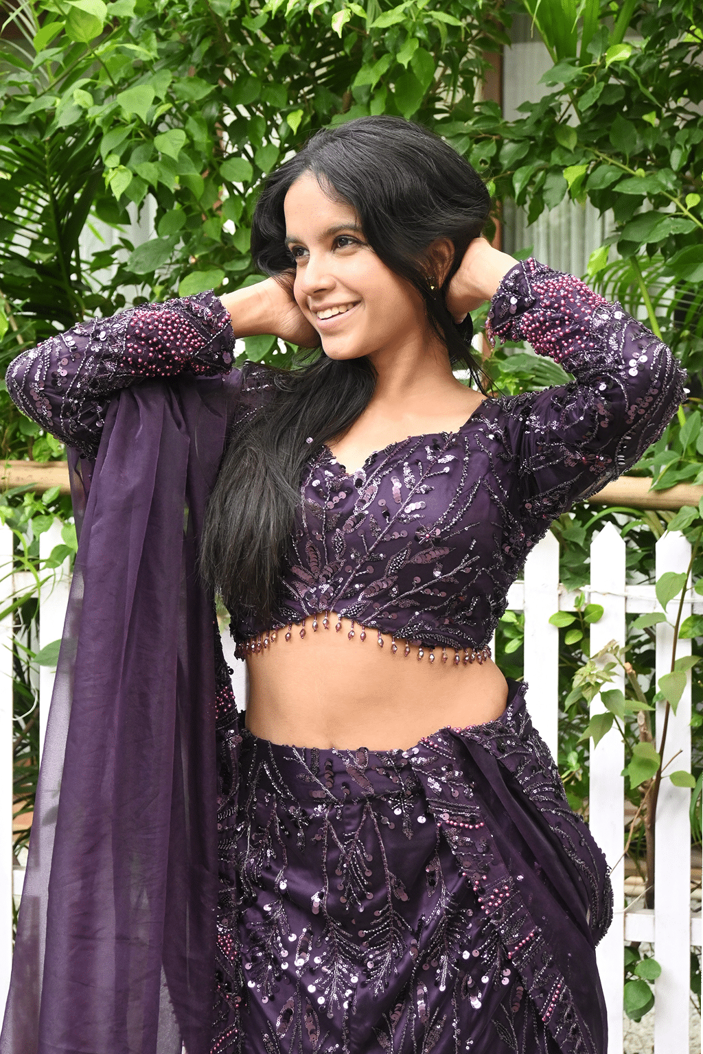 Purple net lehenga and trail detailed with sequin, bead embroidery