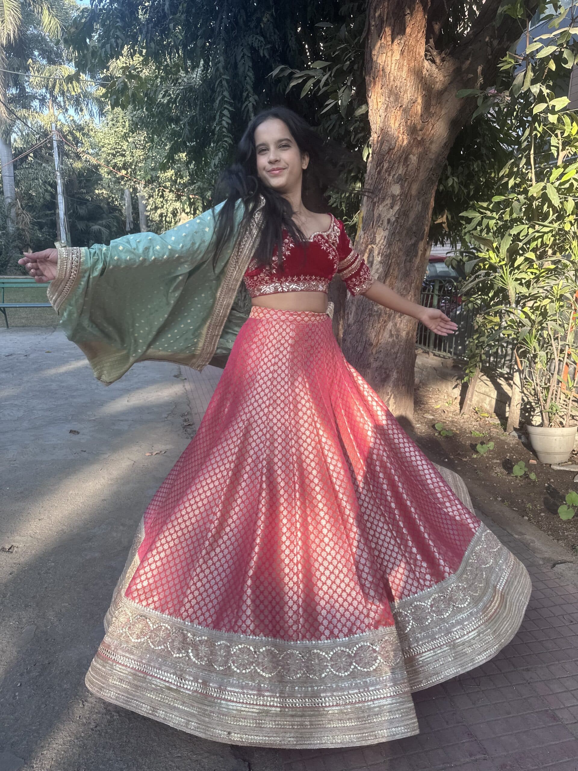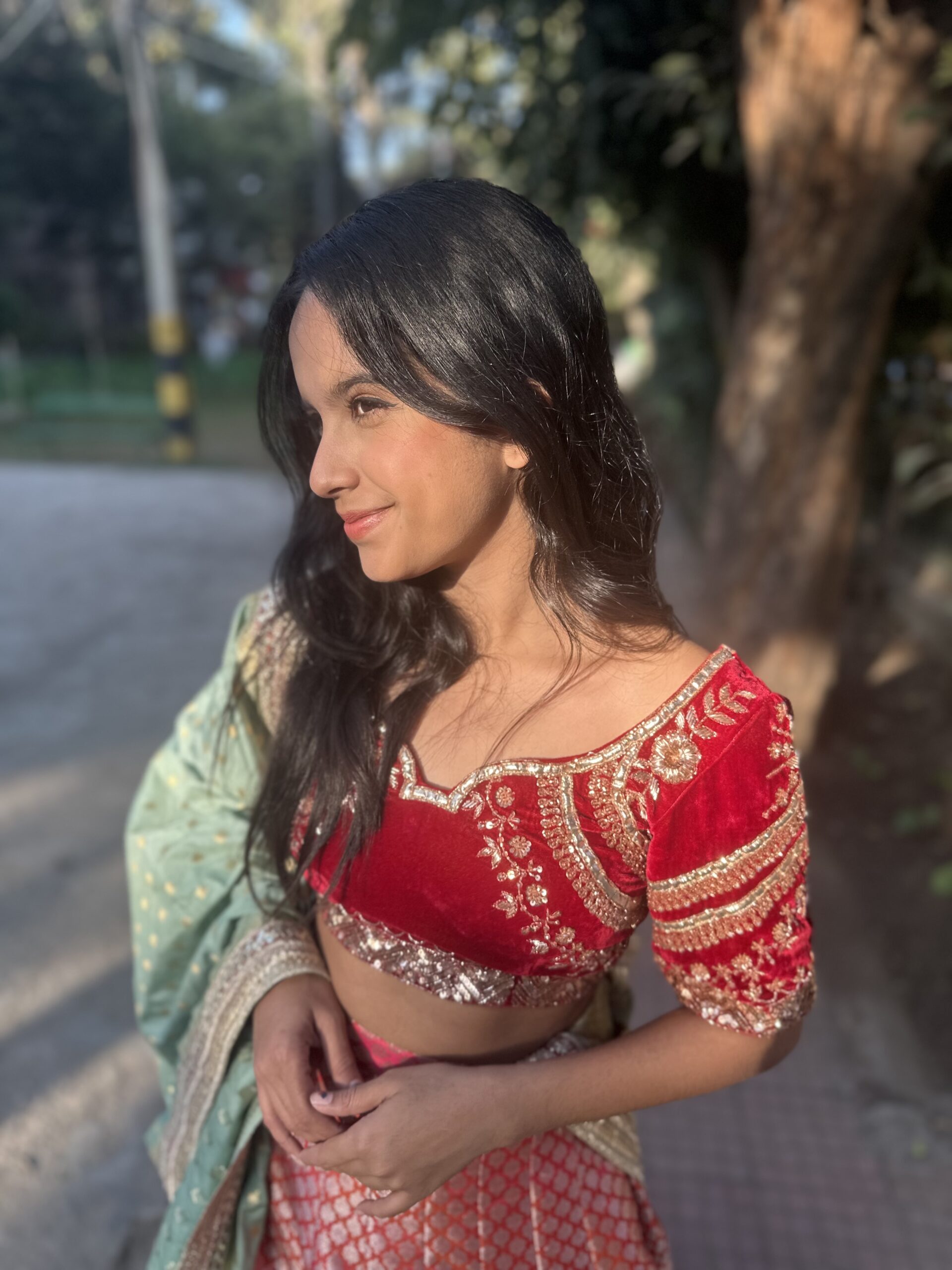 A confident play of jewel tones, Rani Rosette pairs a rich ruby blouse with a softly gleaming rose-pink lehenga and a mint green dupatta for contrast. Designed for bridesmaids who want colour, craft, and ease—this look moves effortlessly from daytime ceremonies to sunset celebrations.