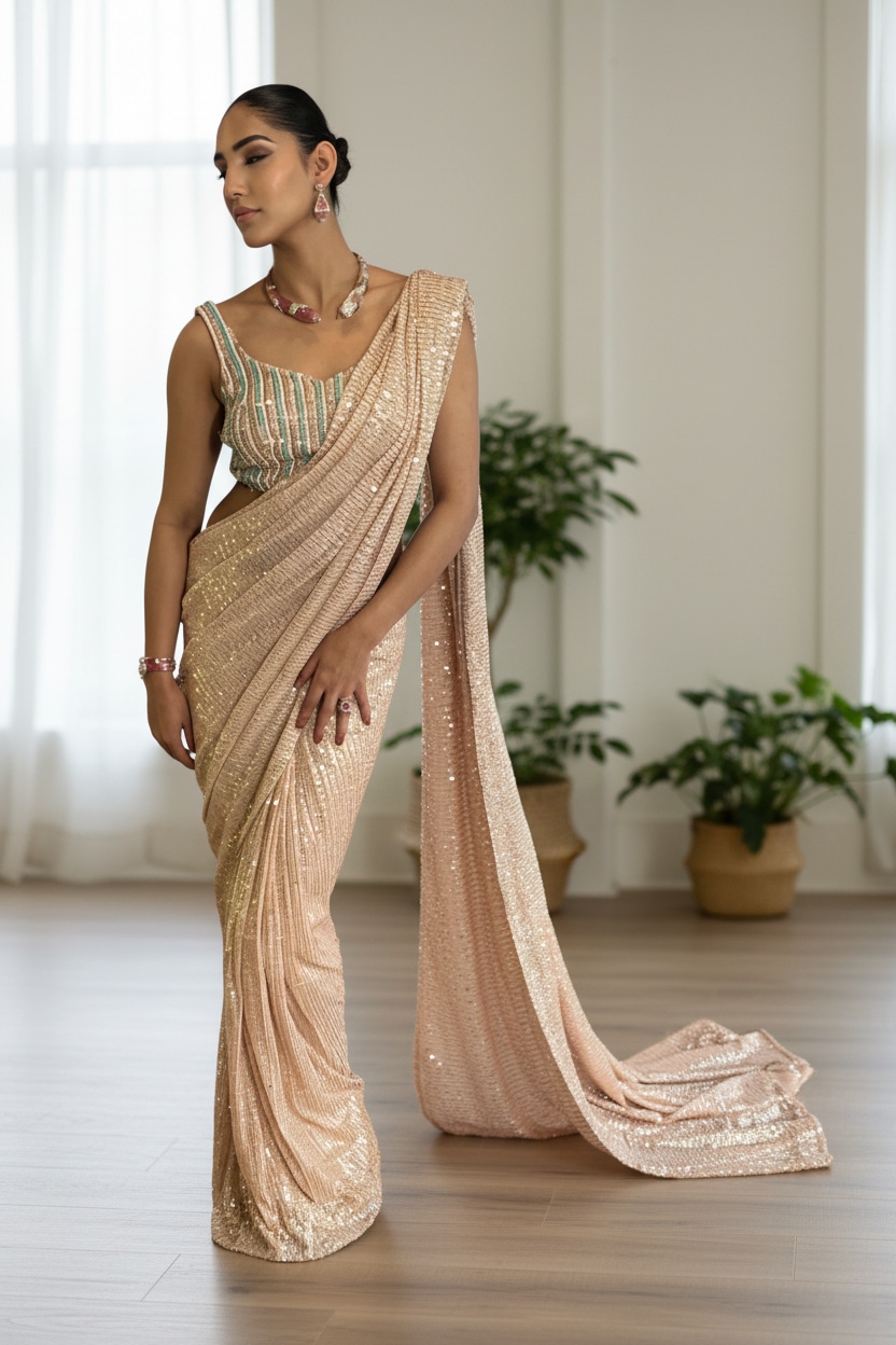 An exquisite ivory saree paired with a crystal-embellished blouse that brings sparkle to every celebration. The soft, luminous drape flows gracefully, while the intricately detailed blouse adds refined glamour. Perfect for weddings, receptions, festival evenings, and special occasions where understated luxury meets modern elegance.