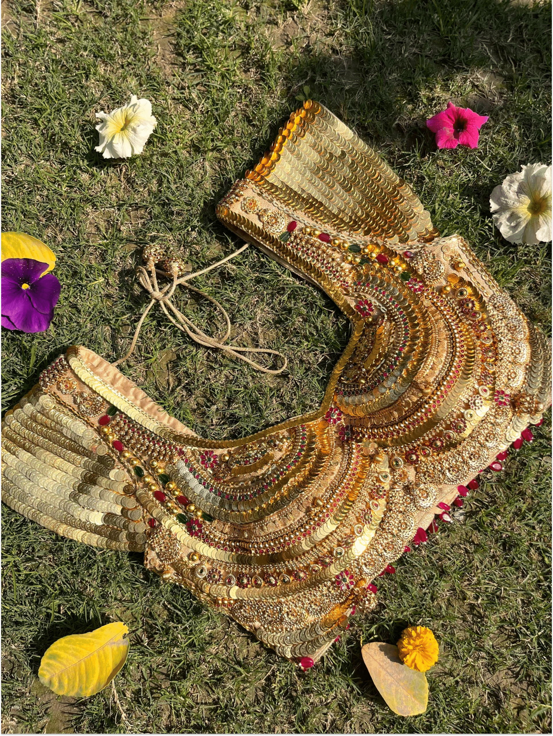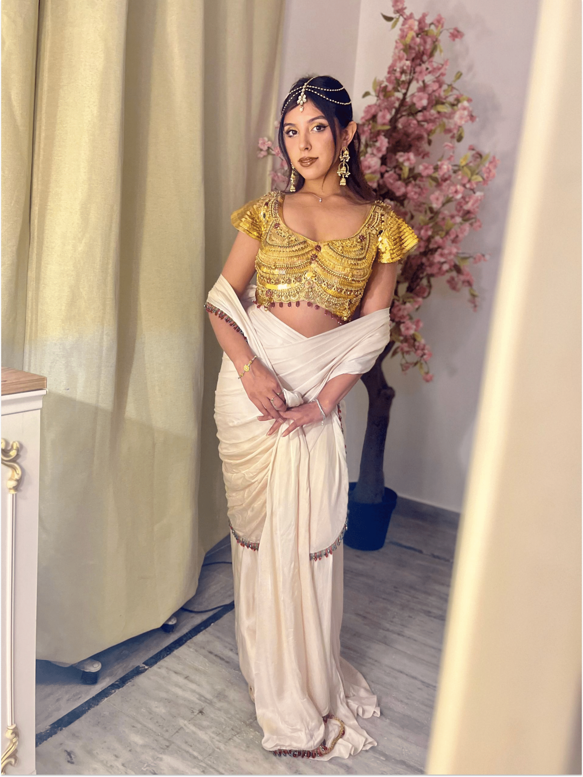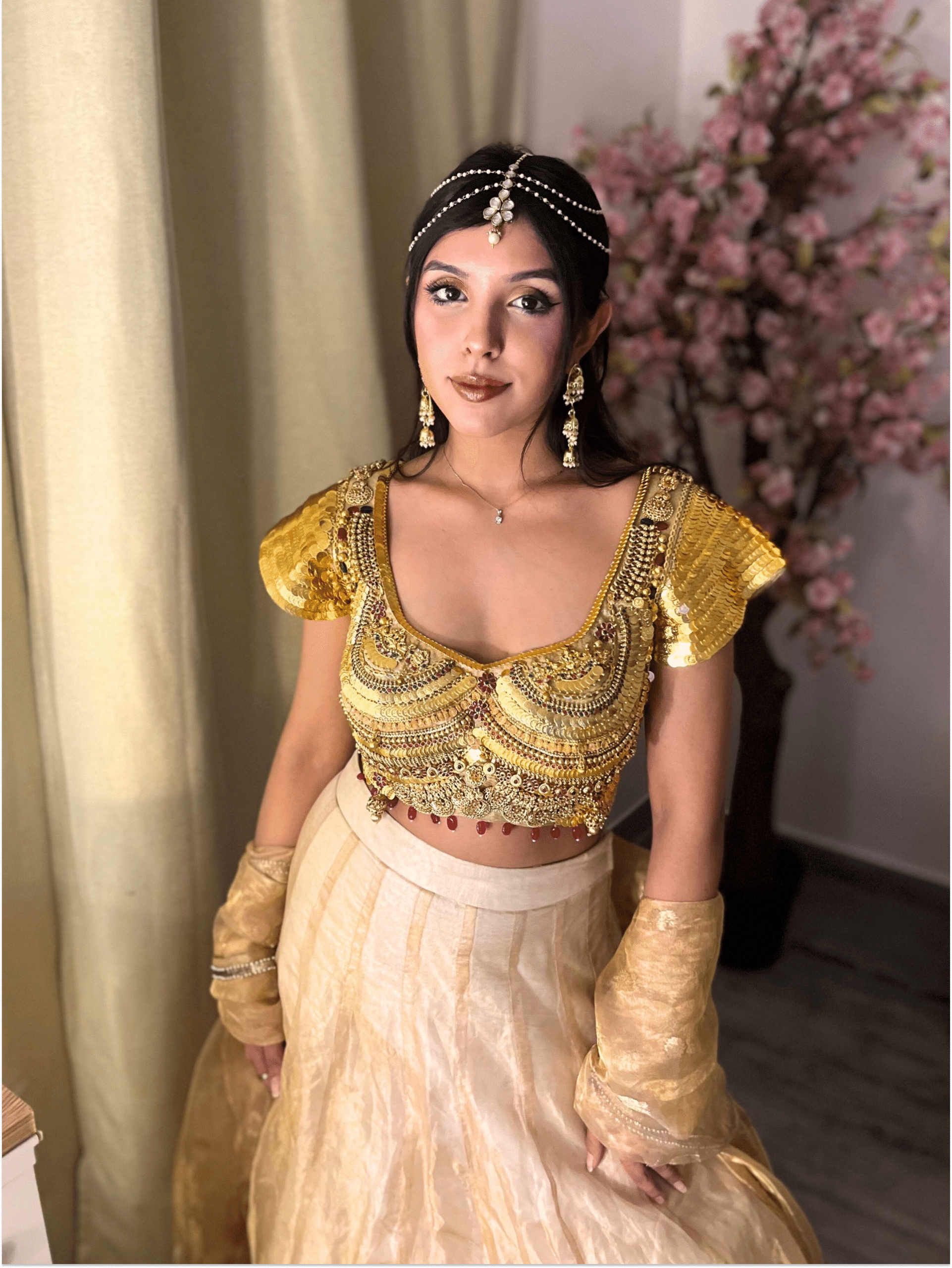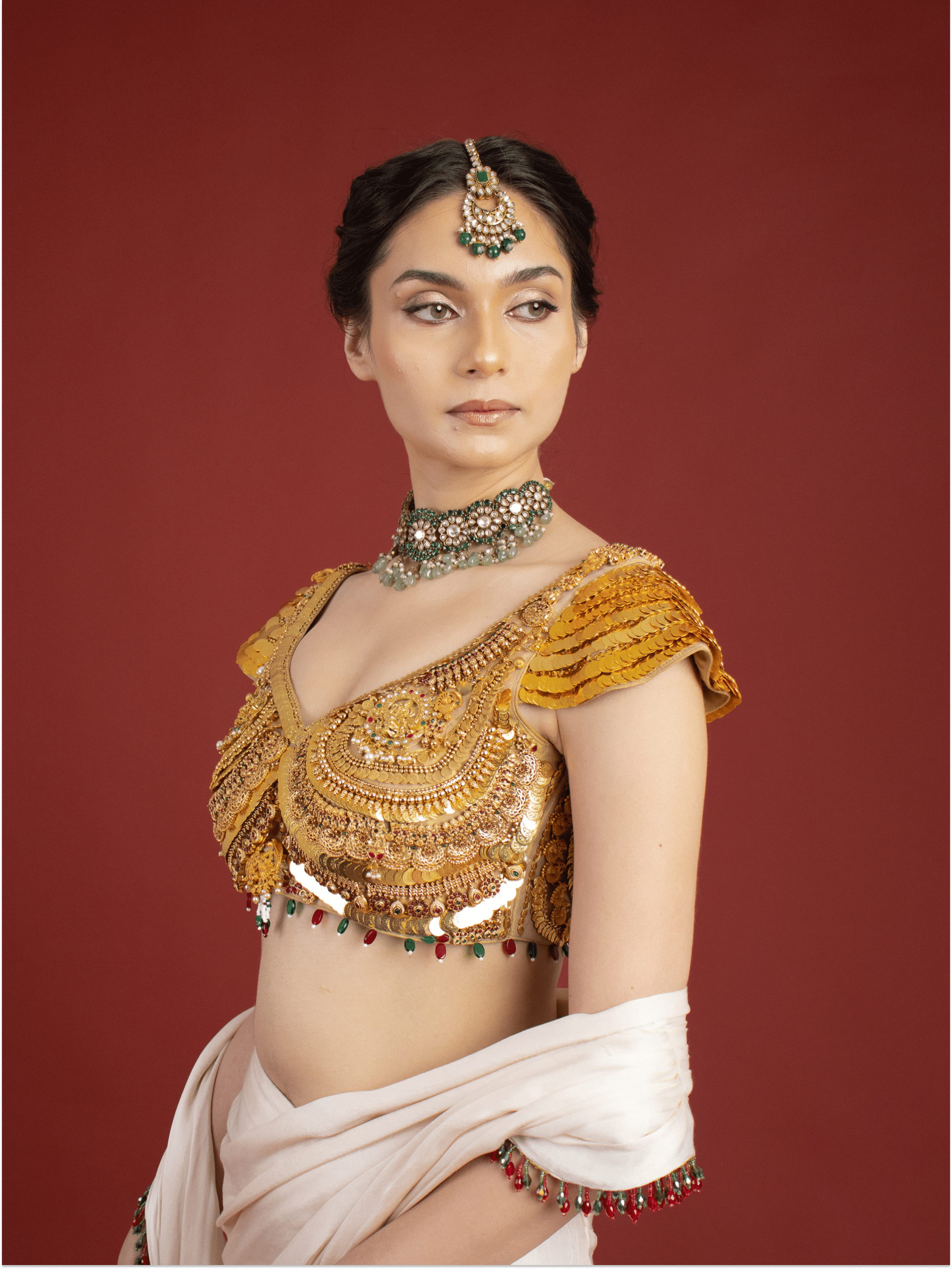 An ornate blouse designed as wearable jewellery. Layers of gold-toned detailing create depth, texture, and luminosity, offering a look that feels ceremonial, powerful, and timeless