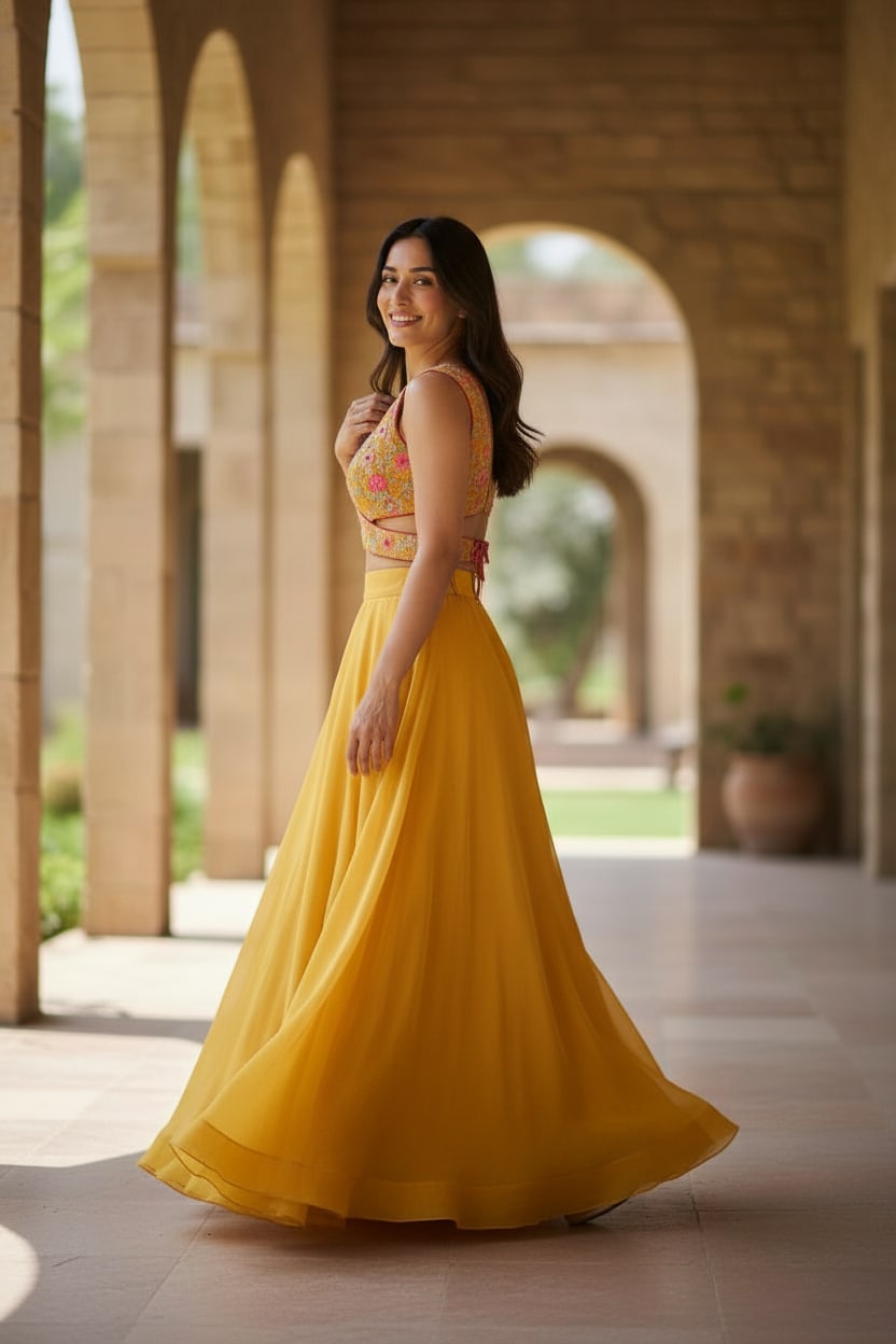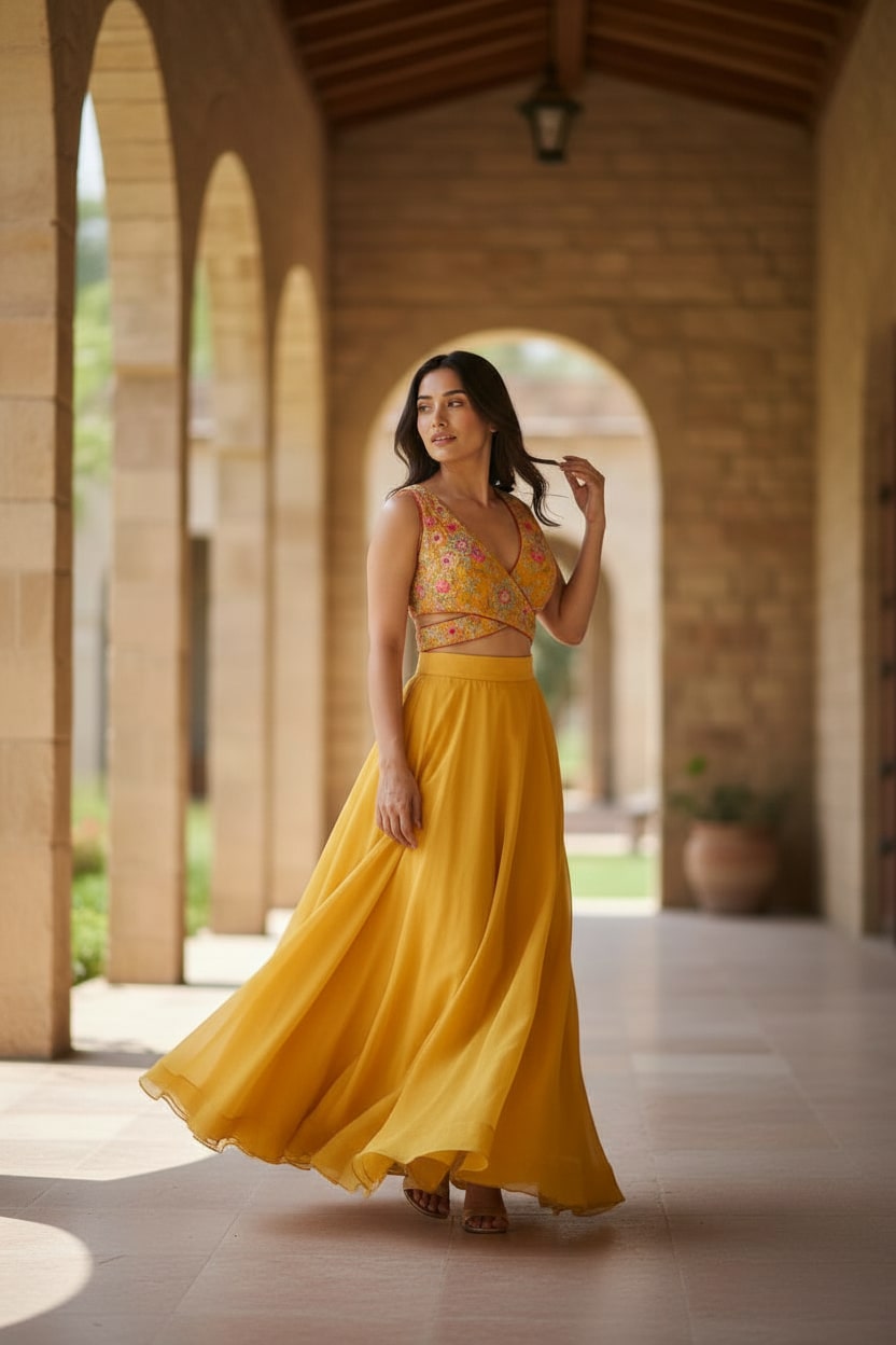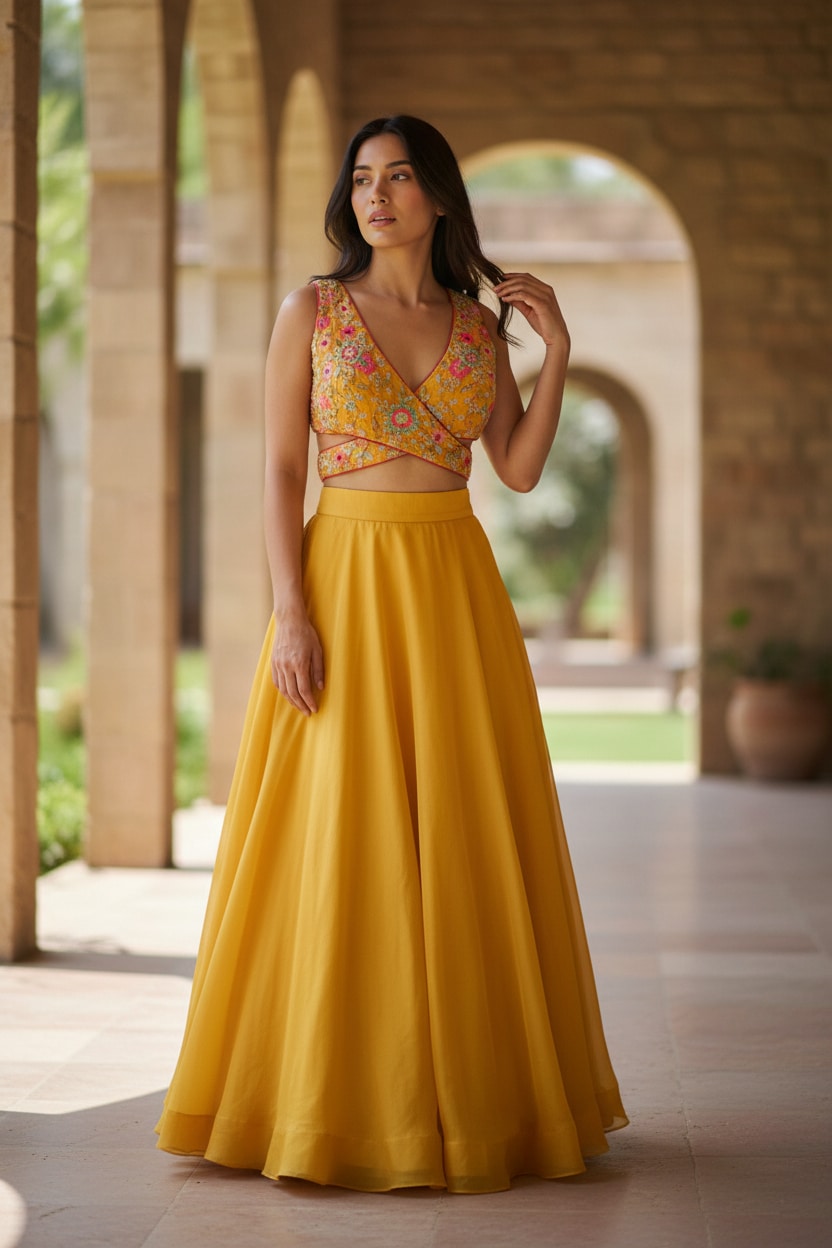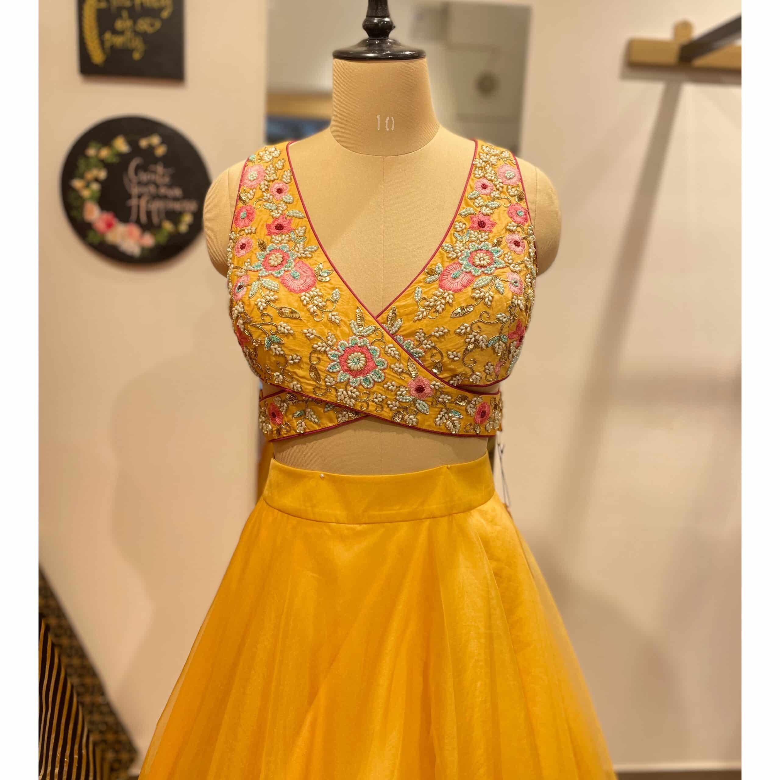 A cheerful yellow lehenga set designed for modern bridesmaids and daytime wedding celebrations. The ensemble features a wrap-style blouse richly embroidered with floral threadwork and subtle bead detailing, creating a flattering, contemporary neckline. Paired with a softly flared tulle lehenga skirt in a matching sunshine hue, the look feels light, playful, and elegant.