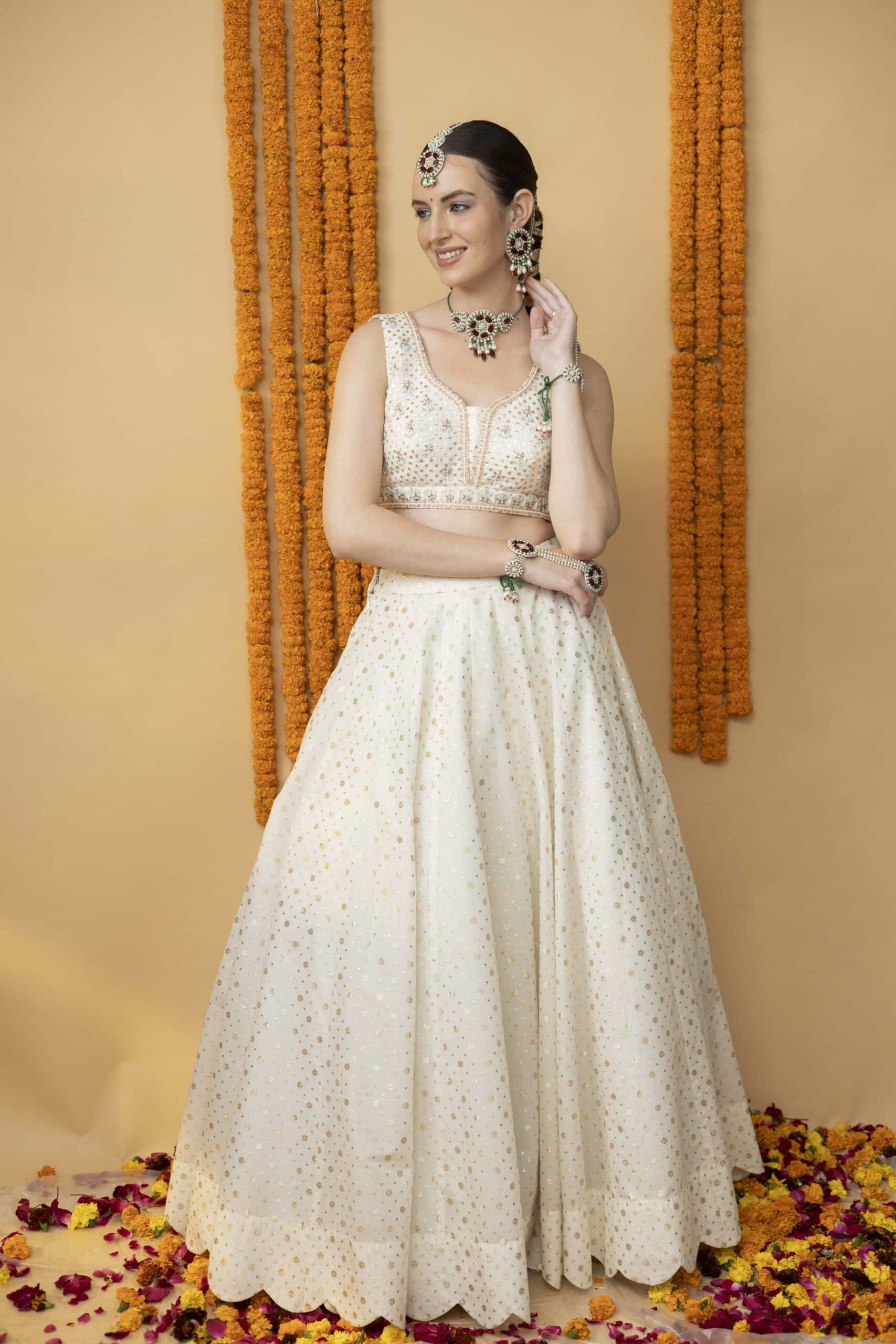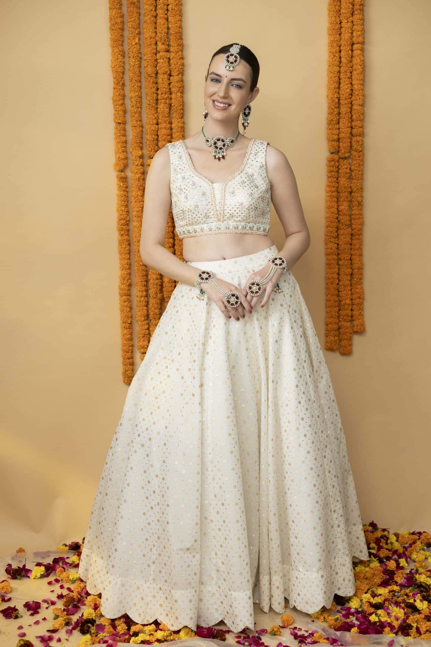 A graceful white Chanderi lehenga choli crafted in lightweight, handwoven Chanderi fabric known for its delicate sheen and airy texture. The ensemble pairs a flowing, subtly embroidered skirt with a coordinated choli and dupatta, creating timeless elegance with a modern twist. Ideal for weddings, daytime functions, festive celebrations, and traditional occasions where refined style meets understated charm.