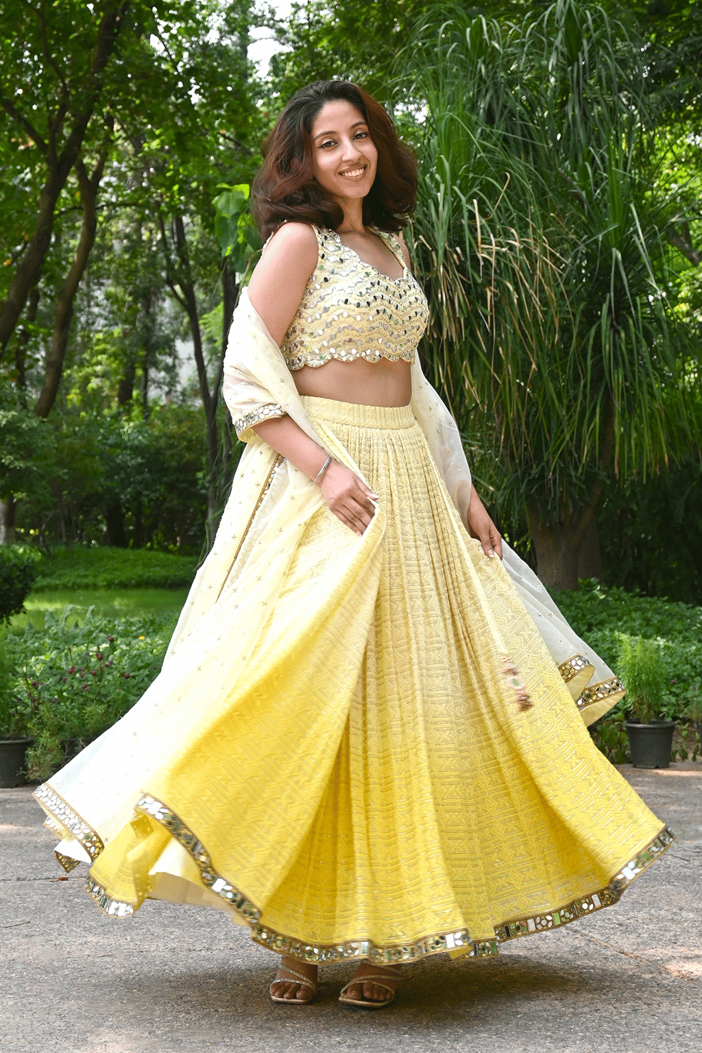 Yellow lehenga with embroidered fabric, mirror detailed and textured weave