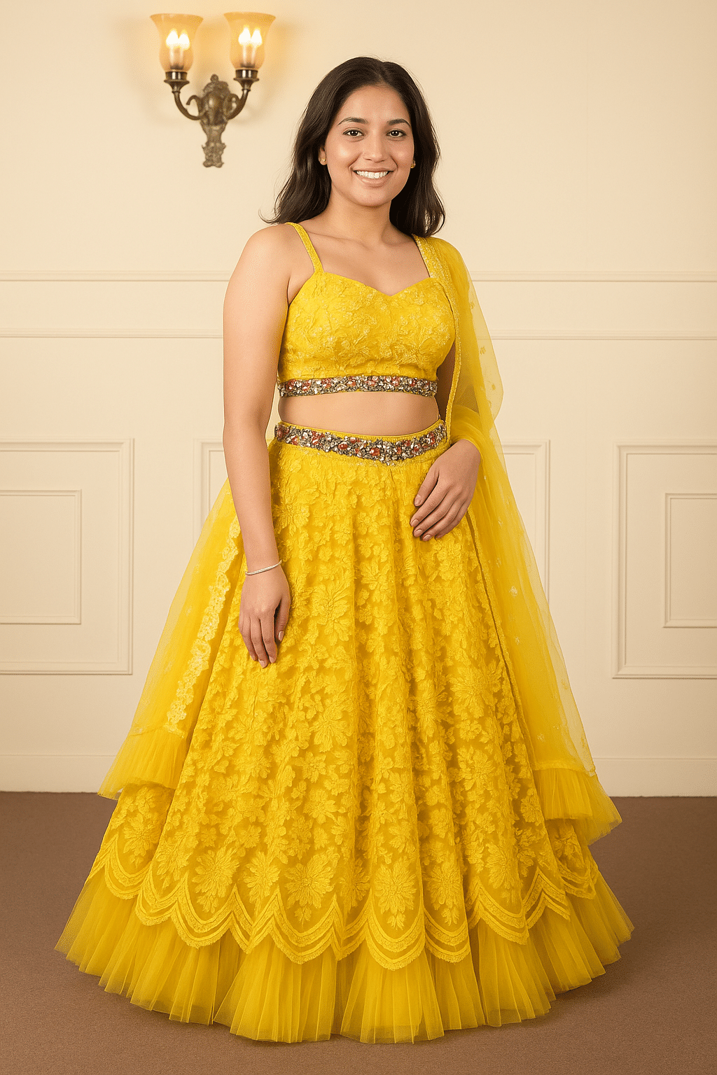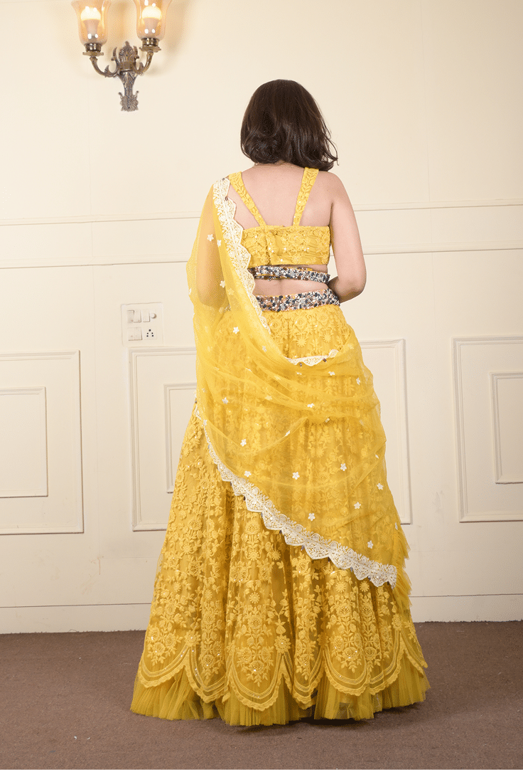 Yellow lehenga with floral embroidery blouse, beaded belt and embroidered dupatta